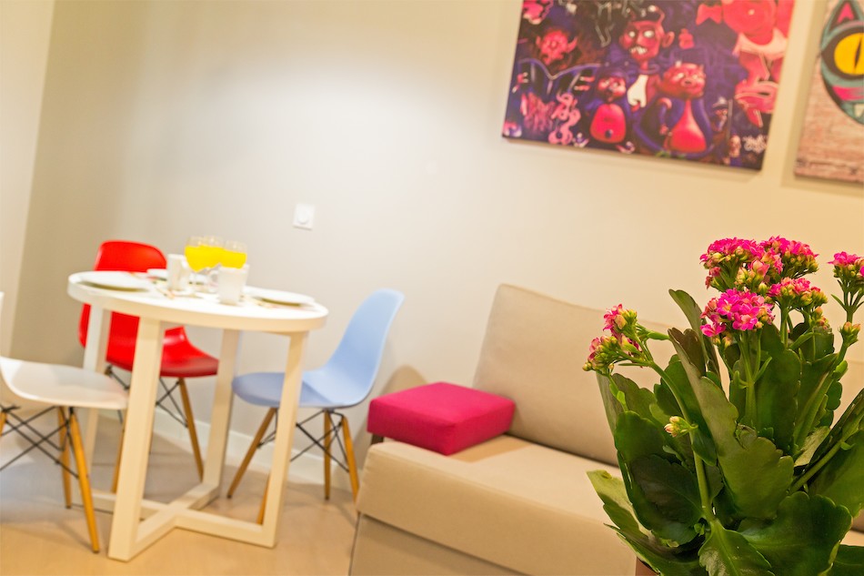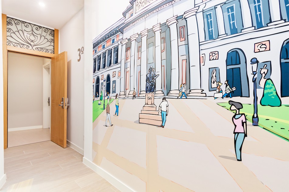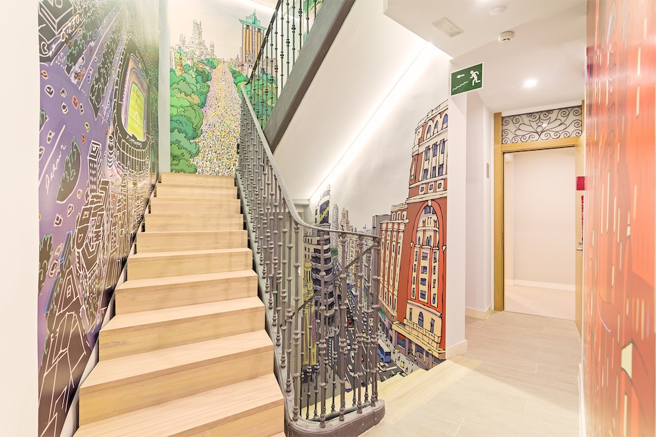 Nada más traspasar su puerta, los alegres y coloristas murales de vinilo del artista Jorge Arranz da la bienvenida a un espacio acogedor y con una ubicación privilegiada si lo que queremos es visitar Madrid.