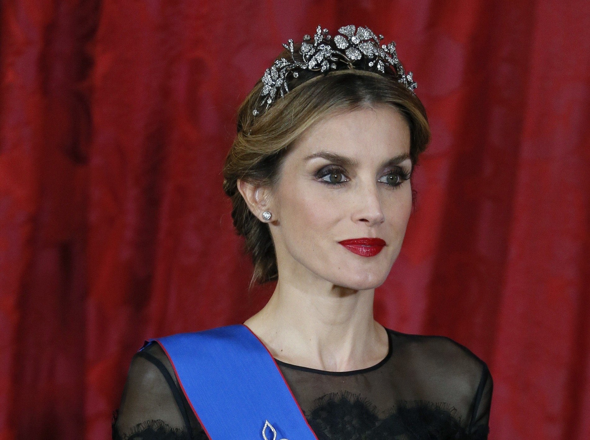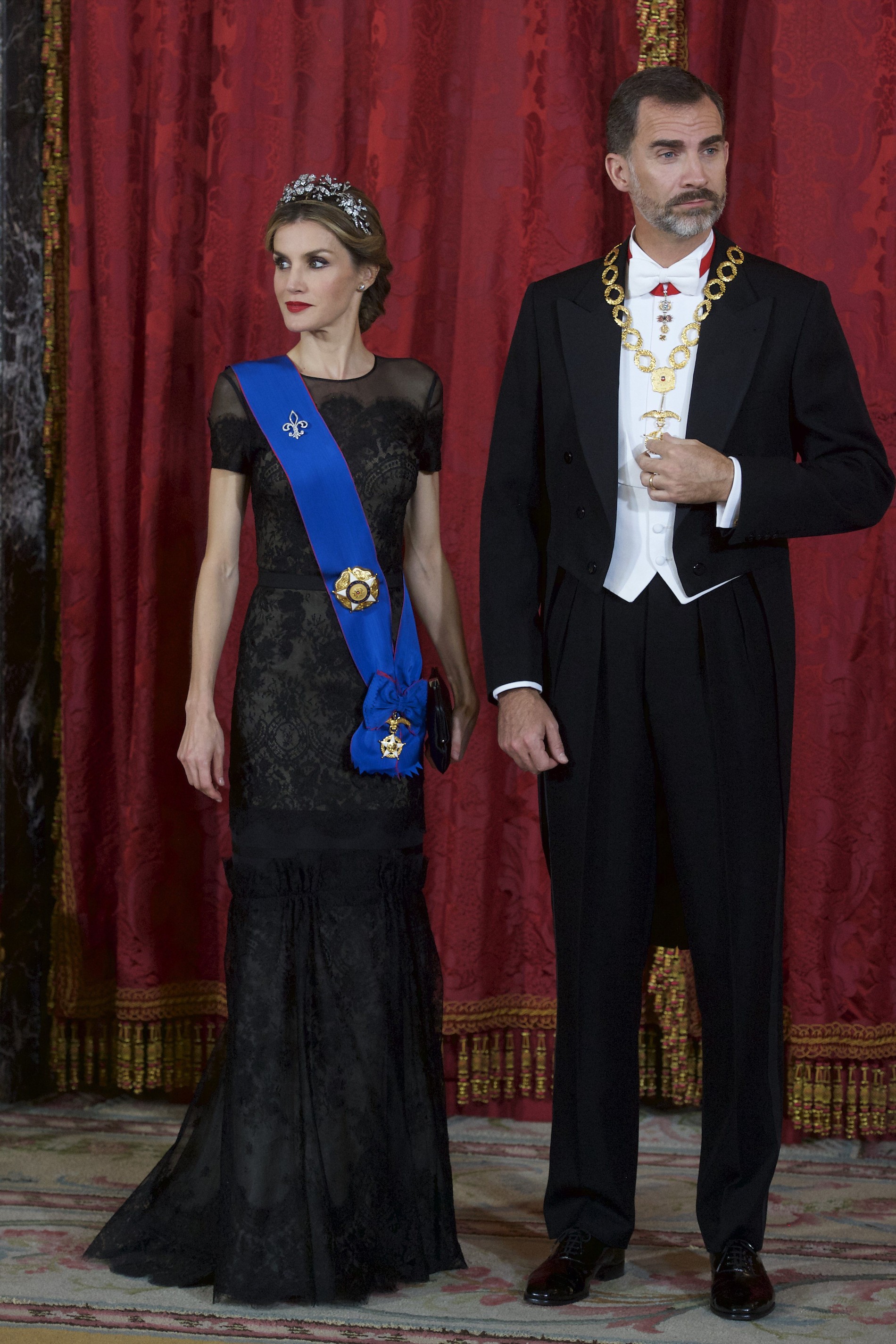 El modelo de Carolina Herrera era de encaje negro y con una pequeña cola. Estaba radiante y deslumbró con este estilismo elegante y sobrio. En cuanto a los complementos, Letizia Ortiz lució la tiara floral de diamantes que Franco le regaló a doña Sofía. También lució el broche de Flor de Lis, emblema de la dinastía Borbón.