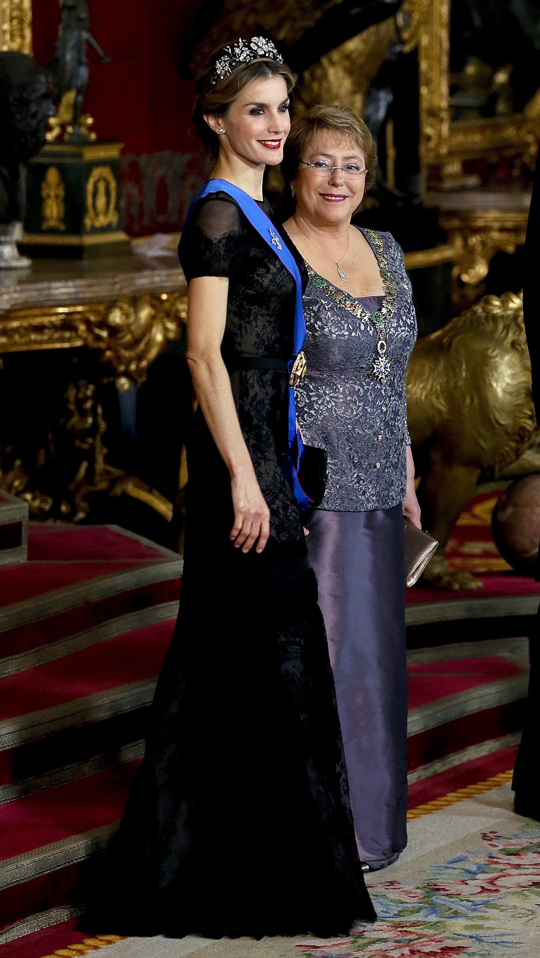 Los reyes de España se enfrentaron este miércoles a la cena de gala más importante desde que llegaron al trono, organizada por la visita de la presidenta chilena, Michelle Bachelet. Para la ocasión, Letizia Ortiz se decantó por un espectacular modelo de Carolina Herrera de color negro, de encaje y con un poco de cola.
