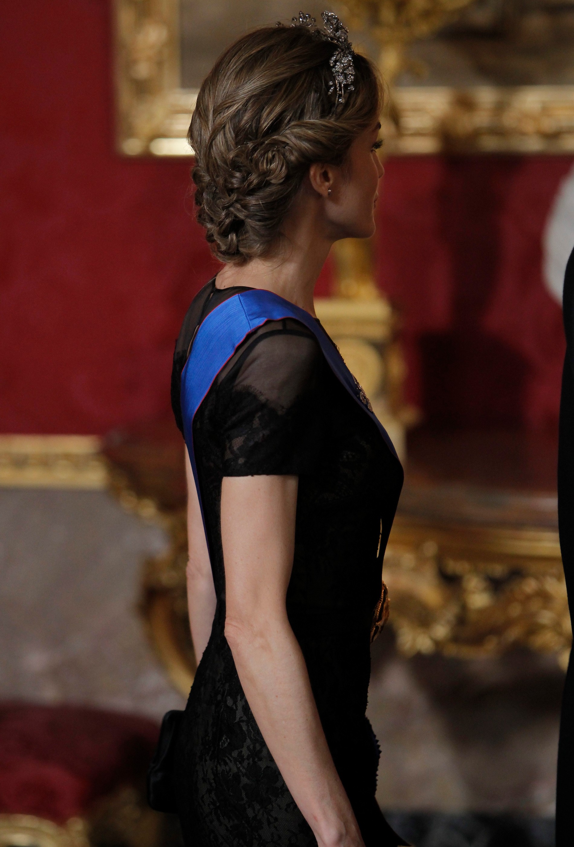 En la cena de gala a la presidenta de Chile, Michelle Bachelet, la Reina apostó por un recogido trenzado muy elaborado, acorde a la ocasión. Lo acompaño con una de sus piezas favoritas, la Tiara Floral de Diamantes, que el Gobierno español regaló a la reina Sofía con motivo de sus nupcias en 1962.