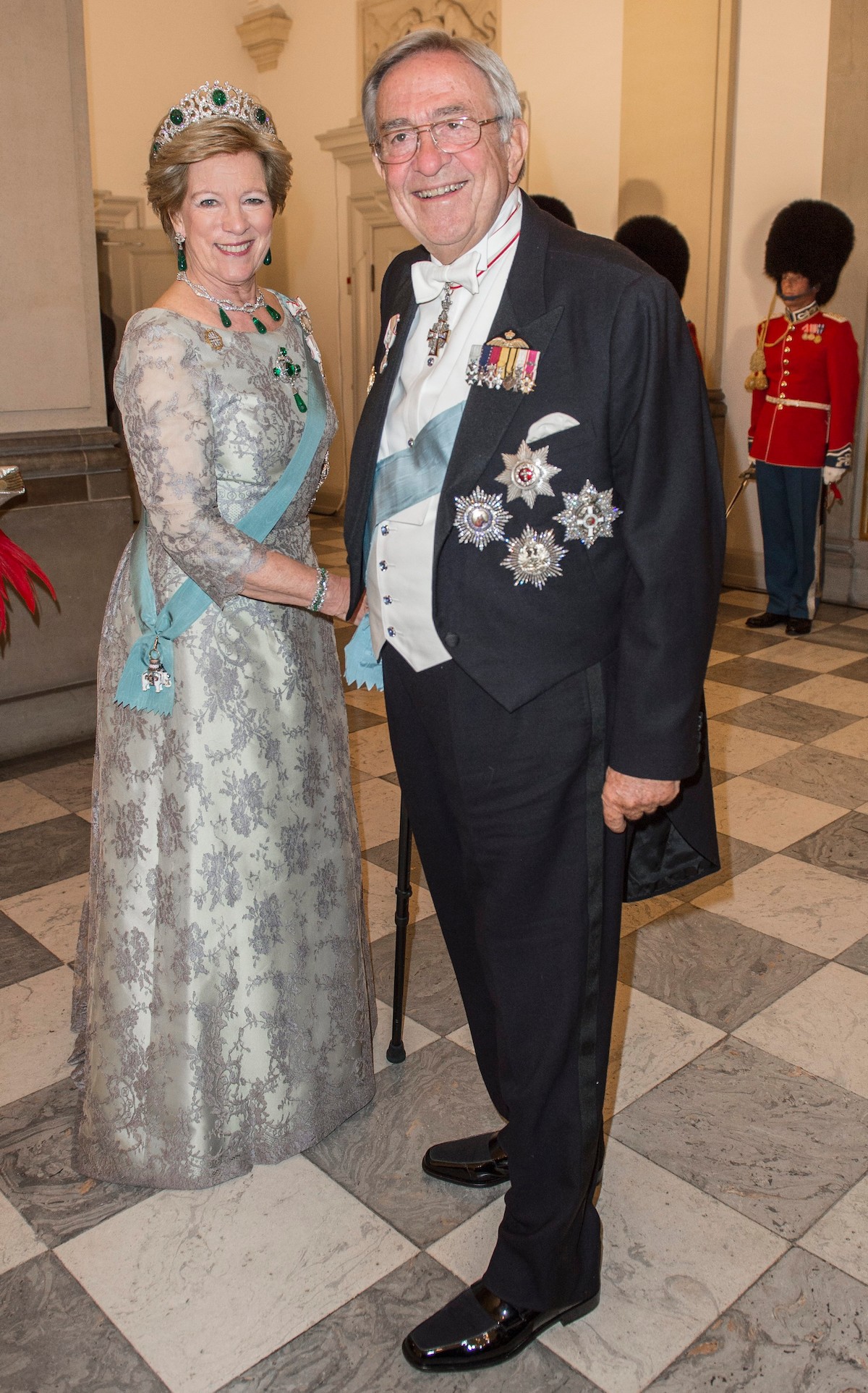 Ana María de Grecia lució un vetsido muy discreto de tonos grises y azulado. Deslumbró con la tiara, collar, pulsera y pendientes de esmeraldas.