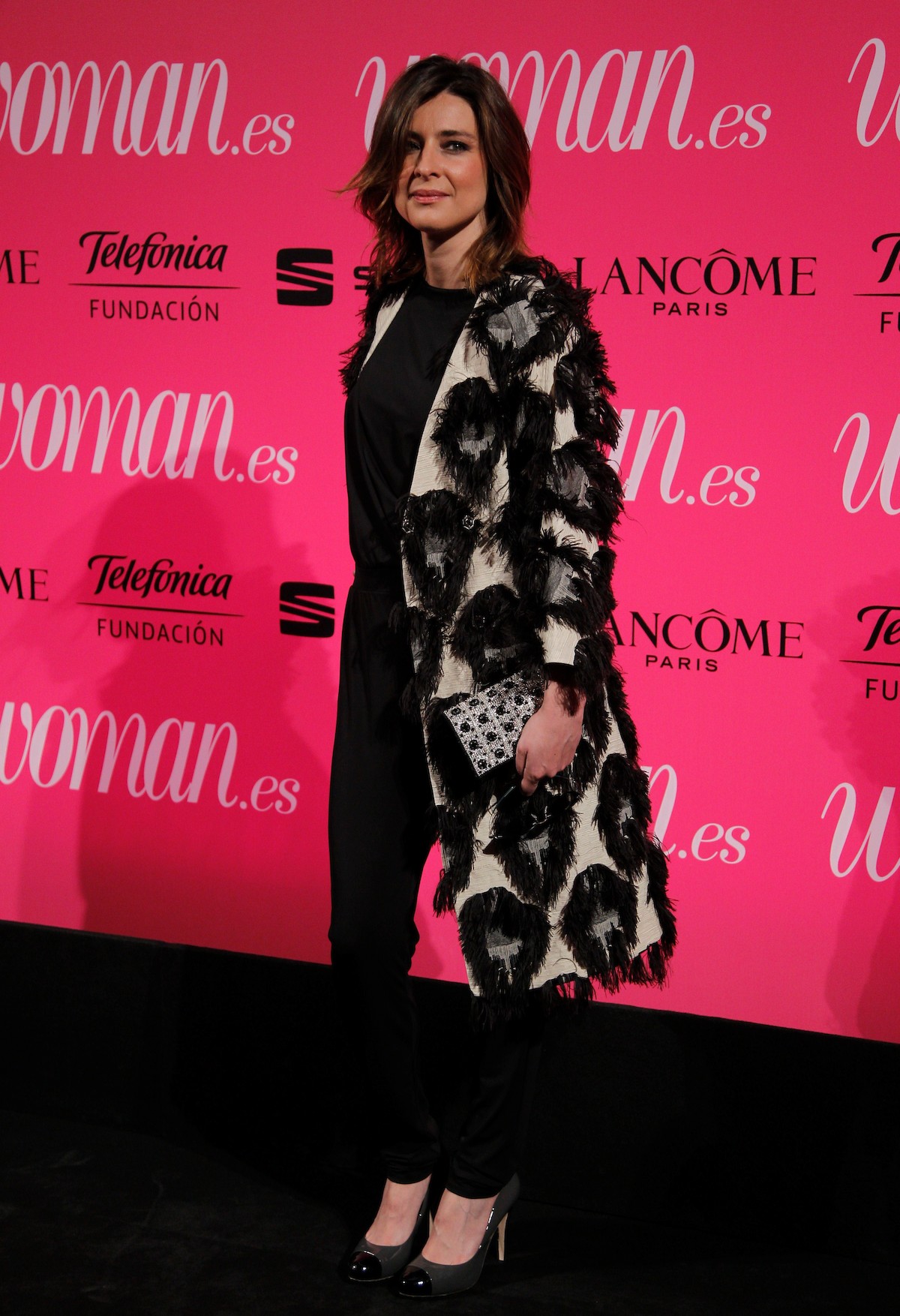 La presentadora Sandra Barneda posó en el photocall con un conjunto negro y un abrigo blanco y negro.
