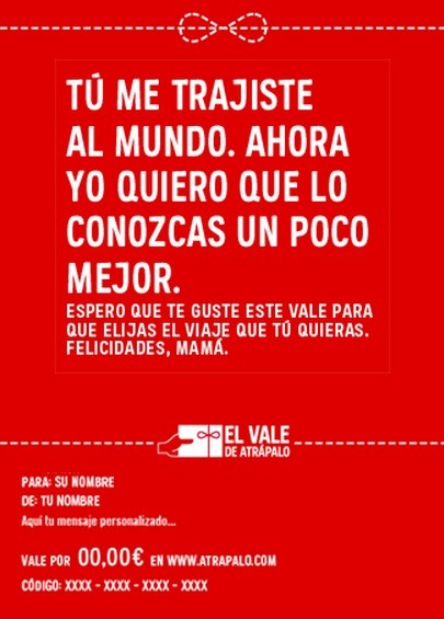 El Vale Regalo de Atrápalo. Una de las opciones para los indecisos o de última hora es el Vale Regalo. Esta opción, cada vez más demandada, cuenta con importantes ventajas: no tiene fecha de caducidad; posibilidad de personalizar con los diferentes modelos disponibles en la web; entrega por email, imprimiéndole o entregándolo personalmente.