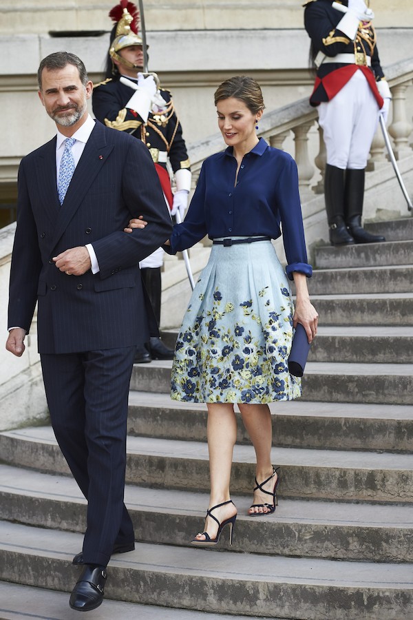 Este favorecedor conjunto lo estrenó el día que el presidente de la República de Italia, Sergio MattarellaEra, visitó España por última vez. Este modelo de Carolina Herrera está formado por una falda de seda blanca con estampado floral en tonos amarillos y azulados y una camisa azul marino.