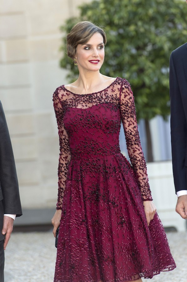 Uno de los modelos que lució en este viaje más comentados es este espectacular vestido de color borgoña que estrenó.