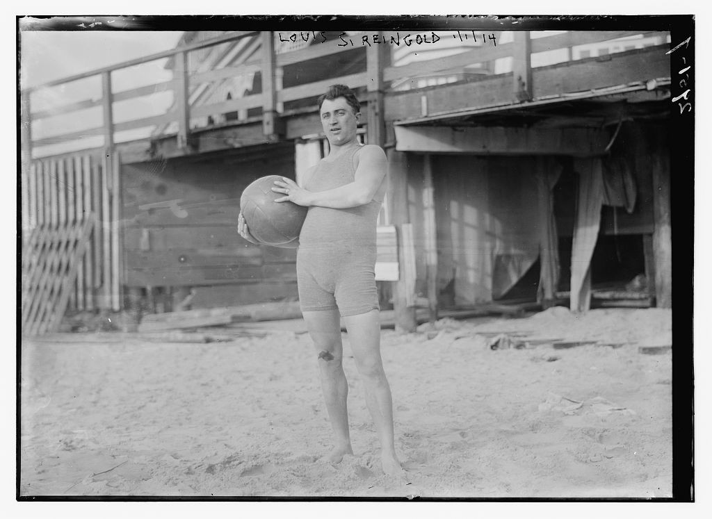 El color no siempre era oscuro. Este señor posa con su traje de baño claro y una pelota en 1914.
