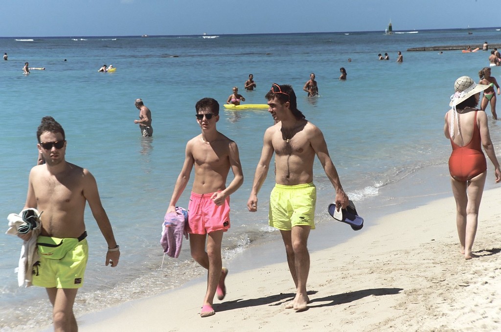 Los colores flúor y el tactel también llegó a los trajes de baño en la década de los 90. En la imagen vemos a tres jóvenes con bañadores muy chillones paseando por la playa. Aunque durante décadas han convivido con la braga náutica, el bañador ha ido evolucionando en colores y tamaños.
