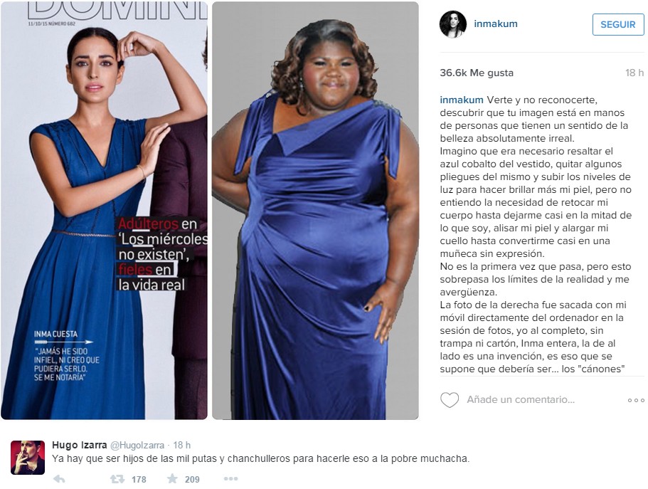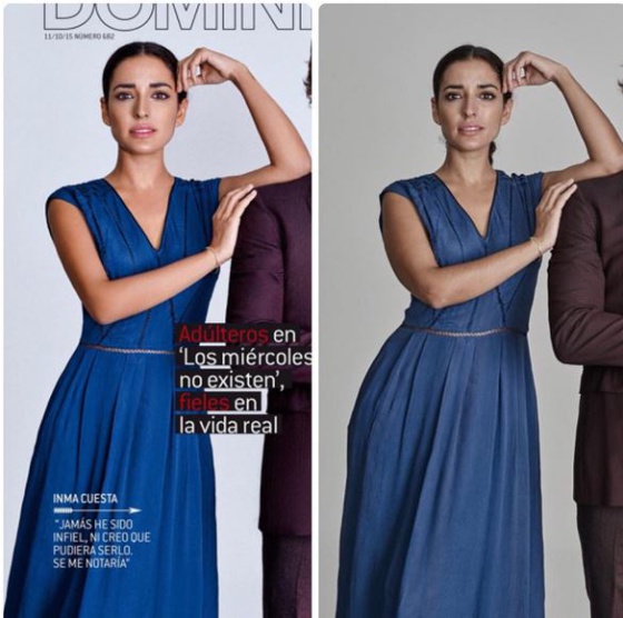 La la izquierda, la foto publicada -y retocada- que tan poco ha gustado a la actriz Inma Cuesta. A la derecha, la imagen original.