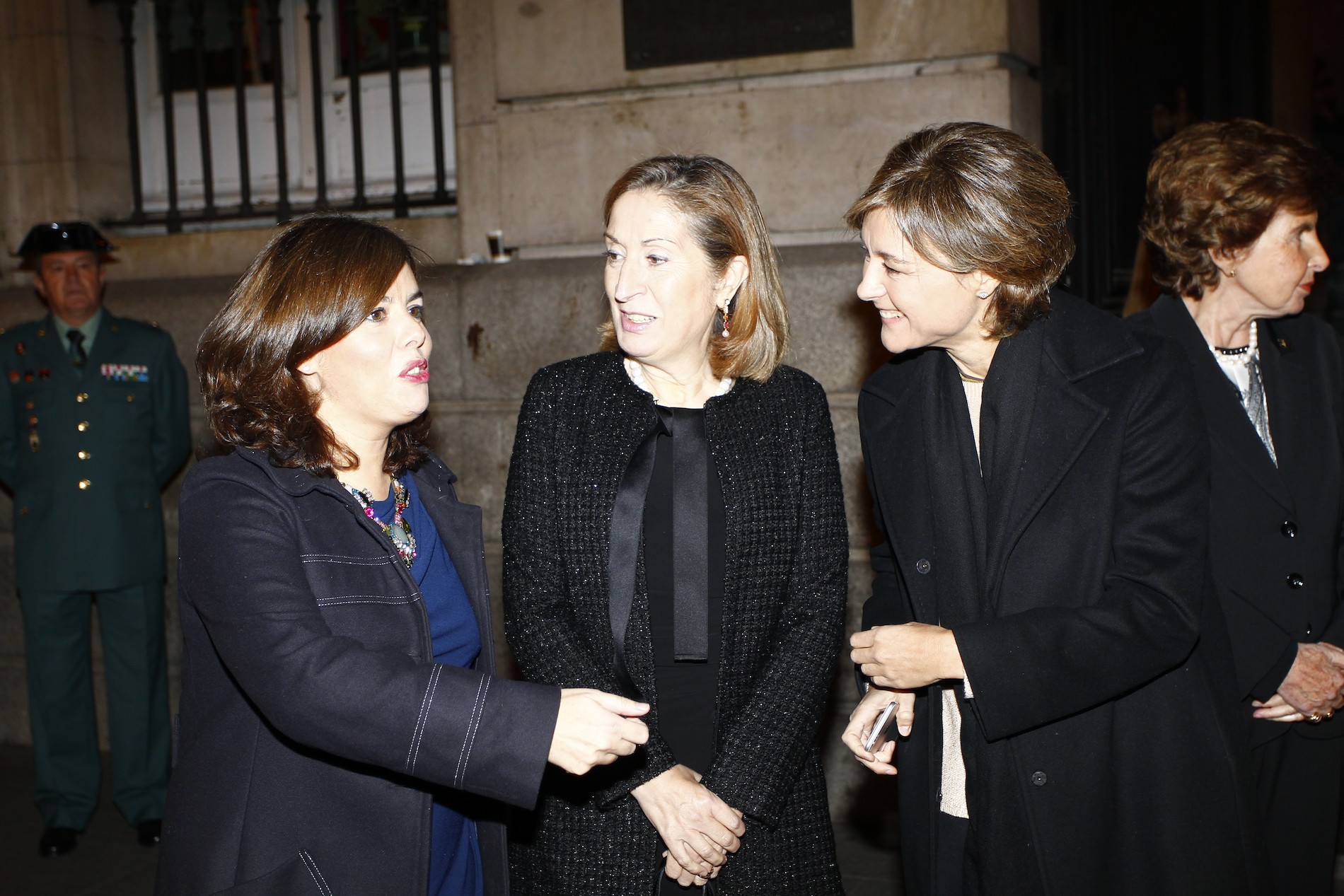 La reina Letizia acudió con un traje de chaqueta negro y el pelo suelto y rizado.