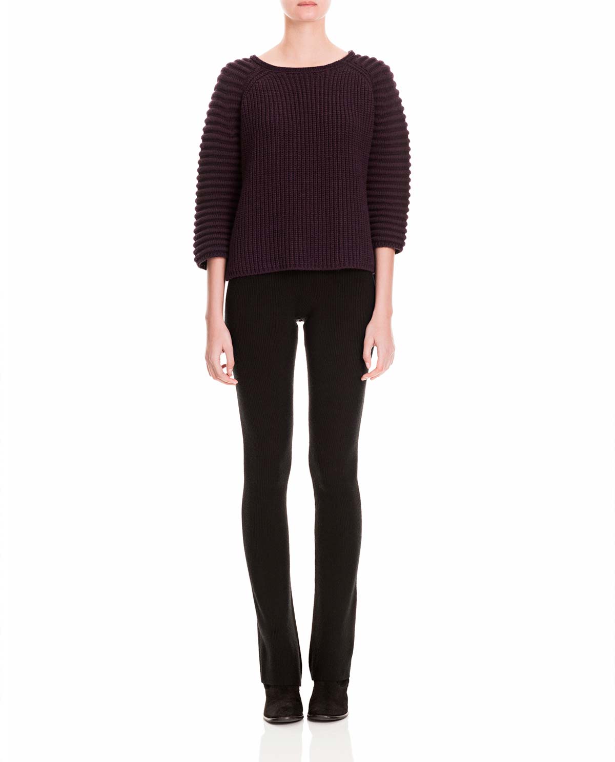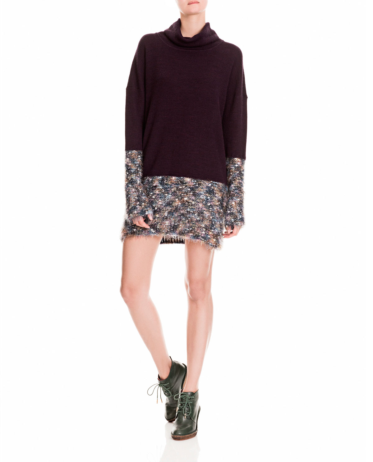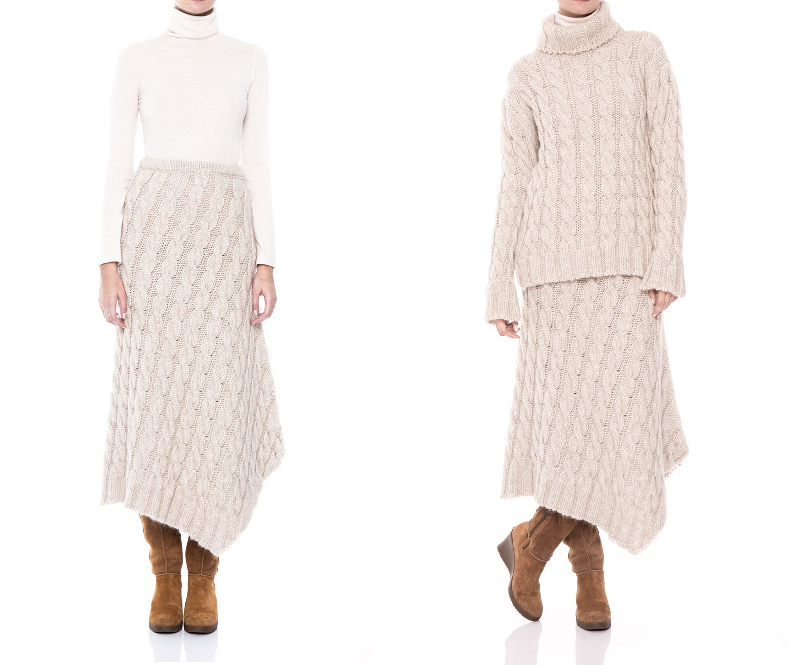 Falda larga trenzada y jersey de cuello alto también trenzado.