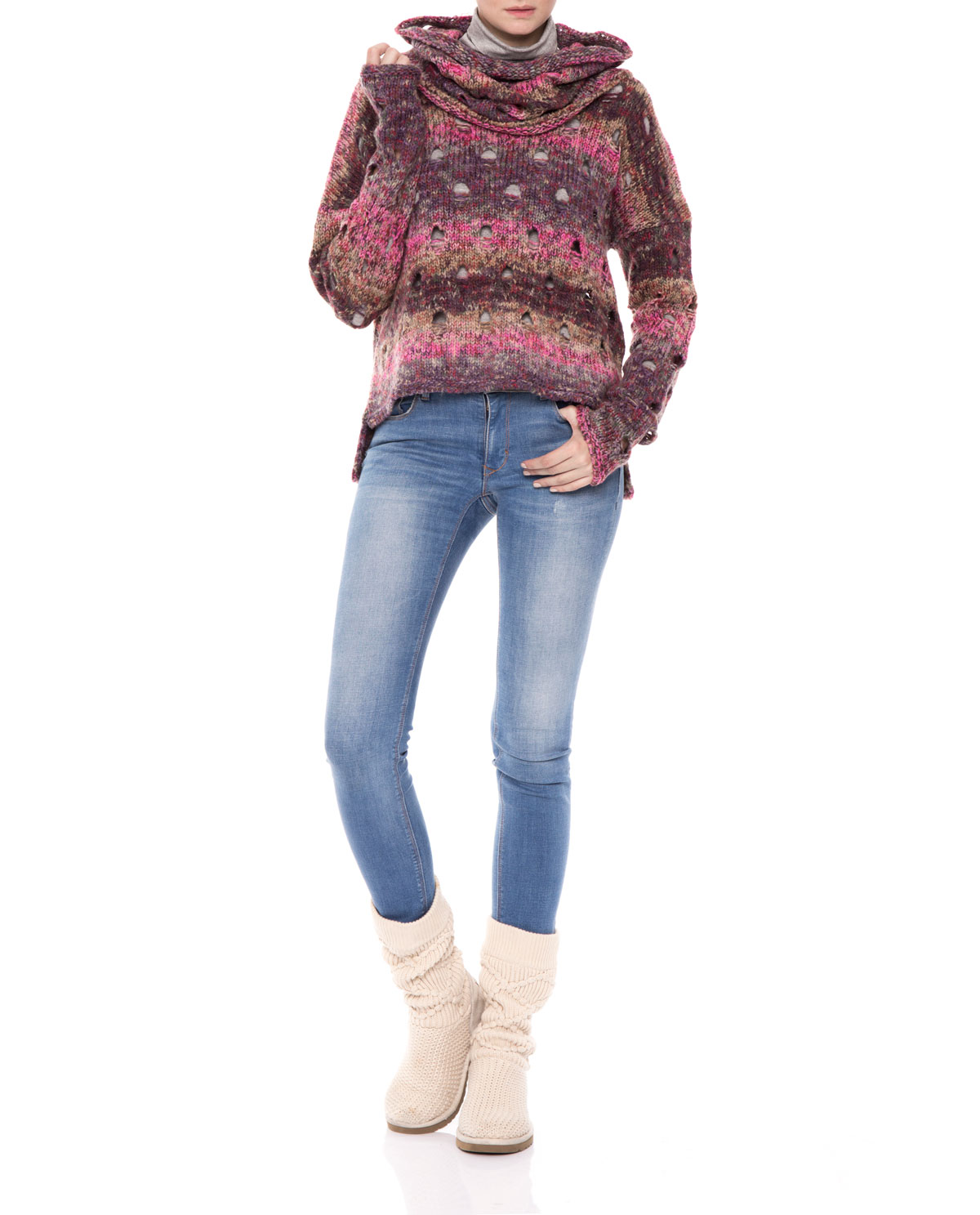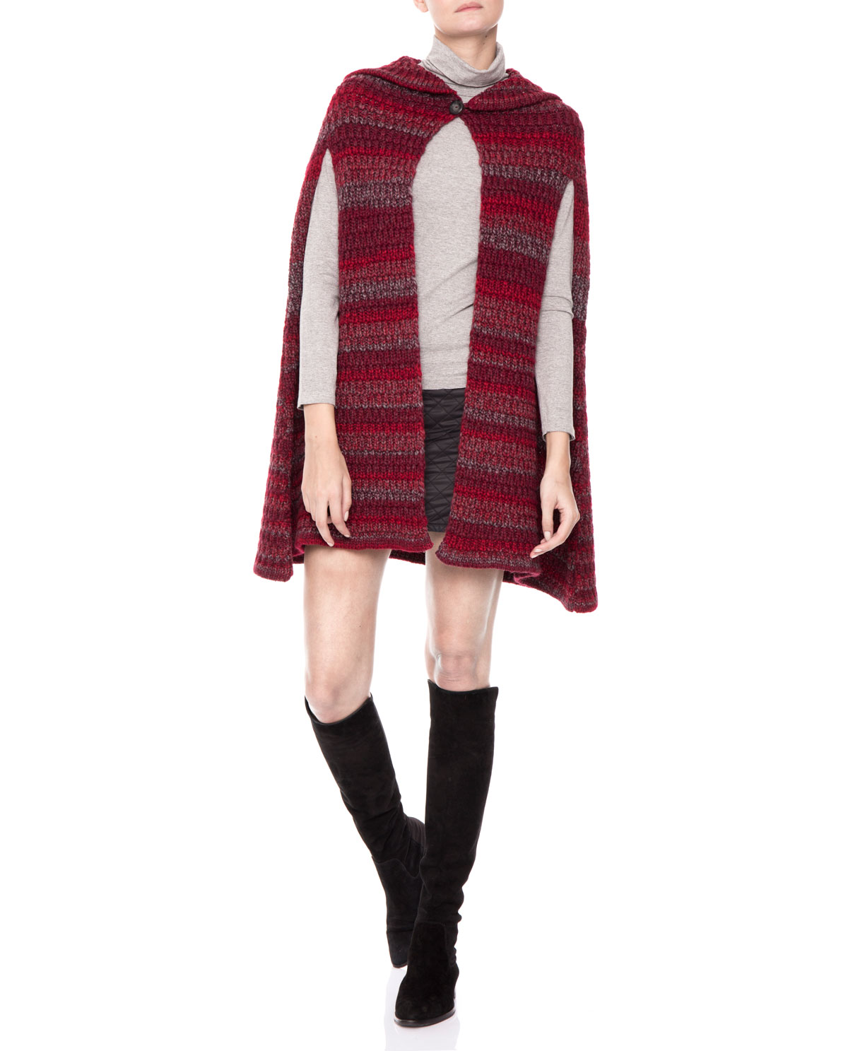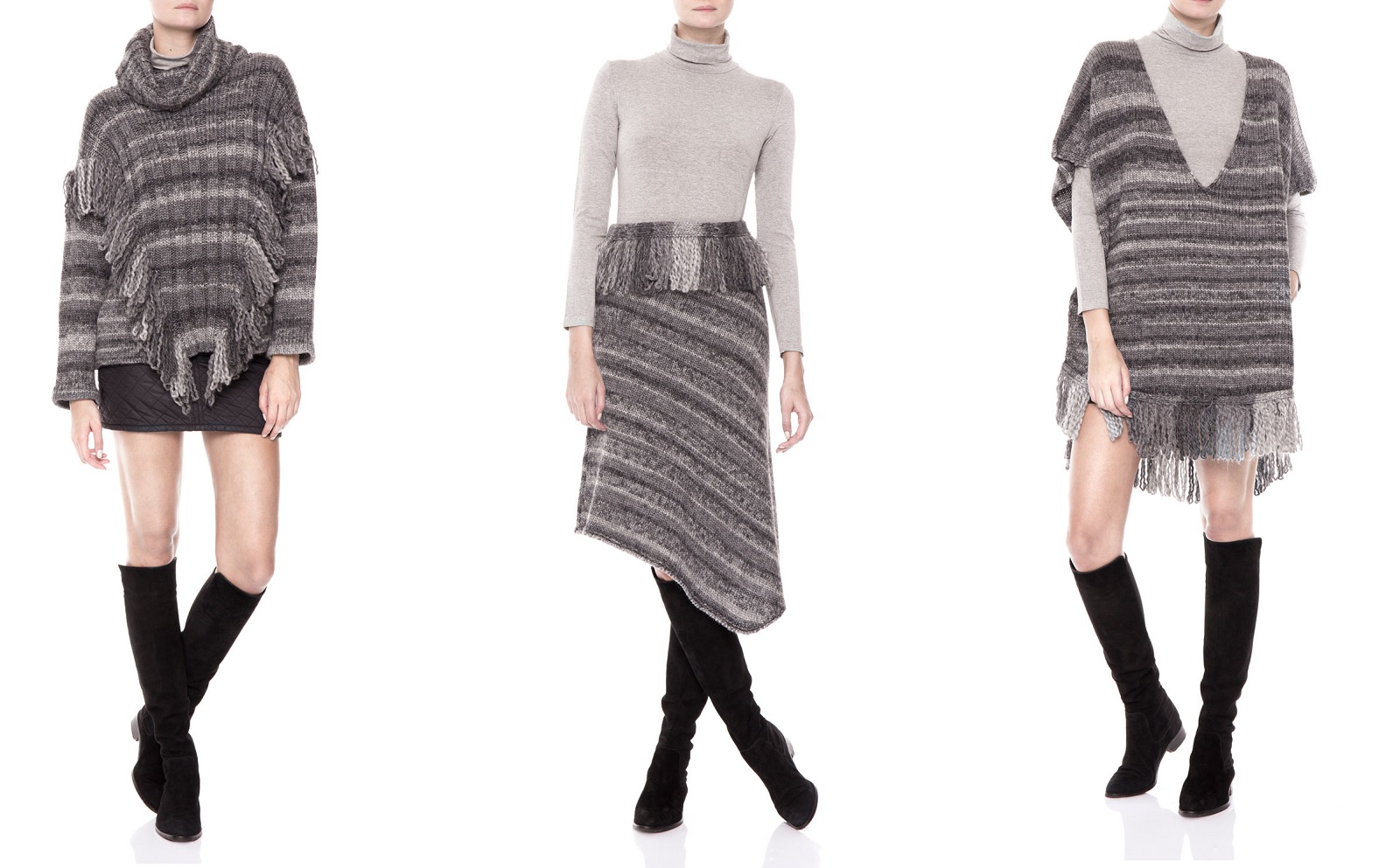 Jersey de punto oversize con flecos, falda de punto midi asimétrica y flecos y poncho de punto abierto también con flecos.