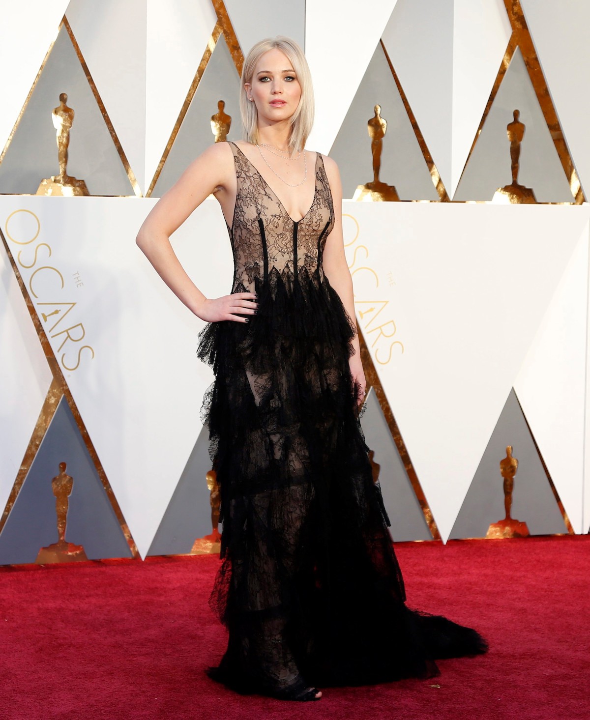 La protagonista de Joy se sumó a la lista de famosas que dejaron boquiabiertos a los espectadores por sus escotes. La parte superior era de encaje negro y color carnr y la inferior de tul negro.