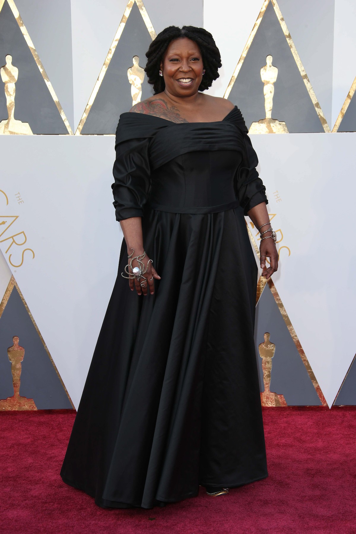 Whoppi fue de las más feas. Aunque el vestido no fue de lo peor de la noche, a ella no le quedaba muy mal. Sus adornos en las manos tampoco le ayudaban a mejorar su estilismo.