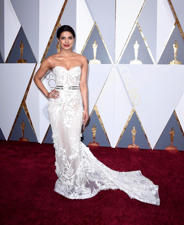 De blanco, con encajes y escote corazón: así llegó a la gala la estrella hindú, a quien comparan con la exuberante Sofía Vergara. El vestido le sentaba muy bien pero es cierto que quizás pegue más para el día de la boda que para este tipo de galas.