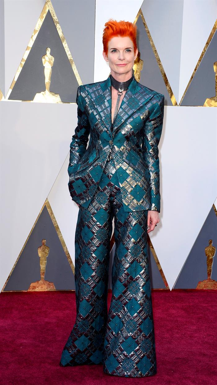 La diseñadora de vestuario llevó un llamativo, por no decir horrible, conjunto de chaqueta y pantalón con un barroco estampado. El llamativo tono de su pelo hizo el resto.