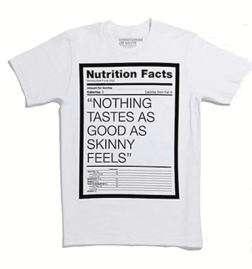 "Nothing tastes as good as skinny feels", es decir, "Nada sabe mejor que sentirse delgada" fueron unas desafortunadas palabras que pronunció la top model Kate Moss en el año 2009. Su frase más "célebre" fue también la más criticada y la acusaron de promover la anorexia. Pero el diseñador Christopher Lee Sauve decidió recuperar la frase para ponerla en una camiseta con tabla de calorías incluida. Aunque Lee se caracteriza por su ironía, para algunos fue demasiado lejos y la camiseta fue retirada.