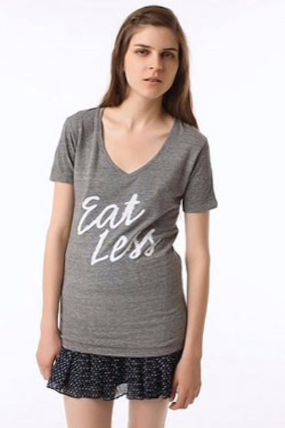Algo parecido ocurrió con la marca estadounidense Urban Outfitters, que ha generado más de una polémica con sus prendas. En 2010, su camiseta "Come menos" hizo saltar las alarmas. En la web, una modelo delgadísima posaba con la polémica camiseta. Un diseño muy sencillo pero con unas palabras muy malintencionadas. La firma la retiró del mercado.