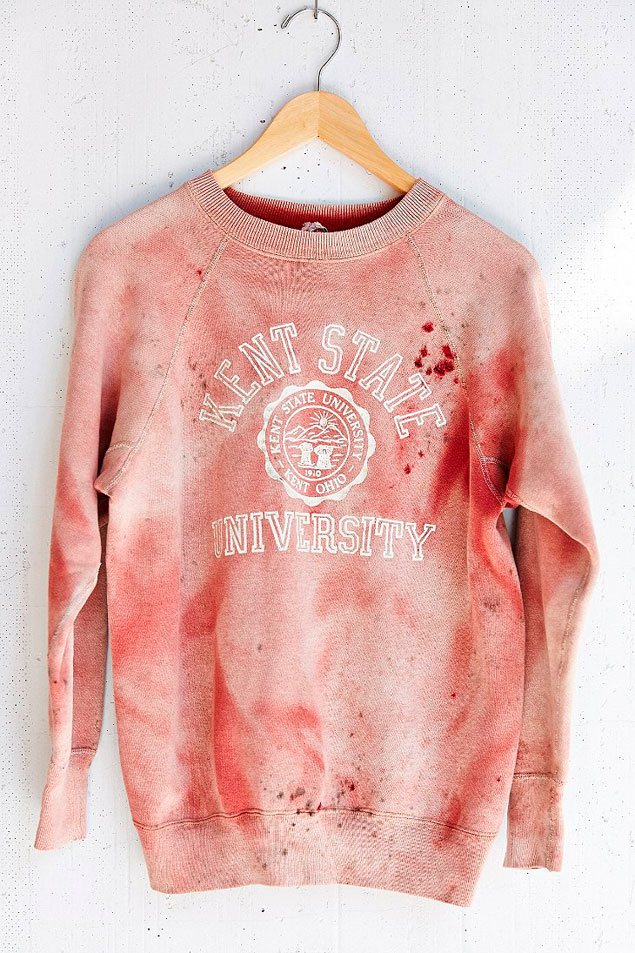 Algún diseñador un tanto macabro de Urban Outfitter tuvo la idea de crear una sudadera de la Universidad de Kent, en la que murieron cuatro estudiantes que protestaban contra la guerra de Vietnam a manos de la Guardia Armada Nacional en los 70. El diseño tenía manchas y puntos rojos que emulaban salpicaduras de sangre. Un curioso homanaje que hizo a la propia universidad pedir su retirada. Aquella sudadera rondaba los 100 euros y no dio tiempo a retirarla porque se había agotado.