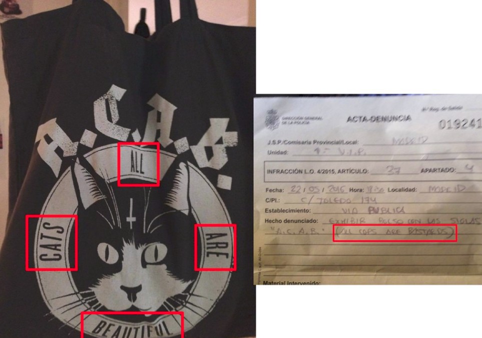 Belén Lobeto, una usuaria de Twitter, denunció a través de su perfil la sanción que le impuso la Policía cerca del Estadio Vicente Calderón. Su bolso contenía las siglas A.C.A,B., acompañadas de la cara de un gato y la leyenda All Cats Are Beautiful, ("todos los gatos son bonitos"). Pero tradicionalmente, a estas siglas se les da otro significado. El movimiento hooligan skinhead las emplea con el significado de All Cops Are Bastards, y que podría traducirse al castellano como "todos los policías son unos bastardos". Una frase común usada tanto por los skinheads de extrema derecha como los de extrema izquierda que la Policía vio como una provocación a la autoridad.