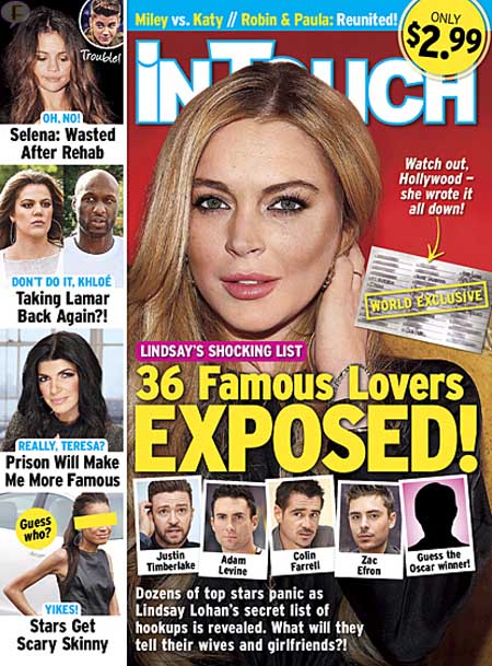 Bueno, venga, aquí van. Adam Levine, Zac Efron, Colin Farrell, Evan Peters, James Franco, Garrett Edlund, el beisbolista Jamie Burke y el empresario artístico PC Valmorbida.... Todos ellos confirmados por la actriz. La revista ocultó varios nombres debido a que tenían pareja en el momento de su noche con Lindsay.