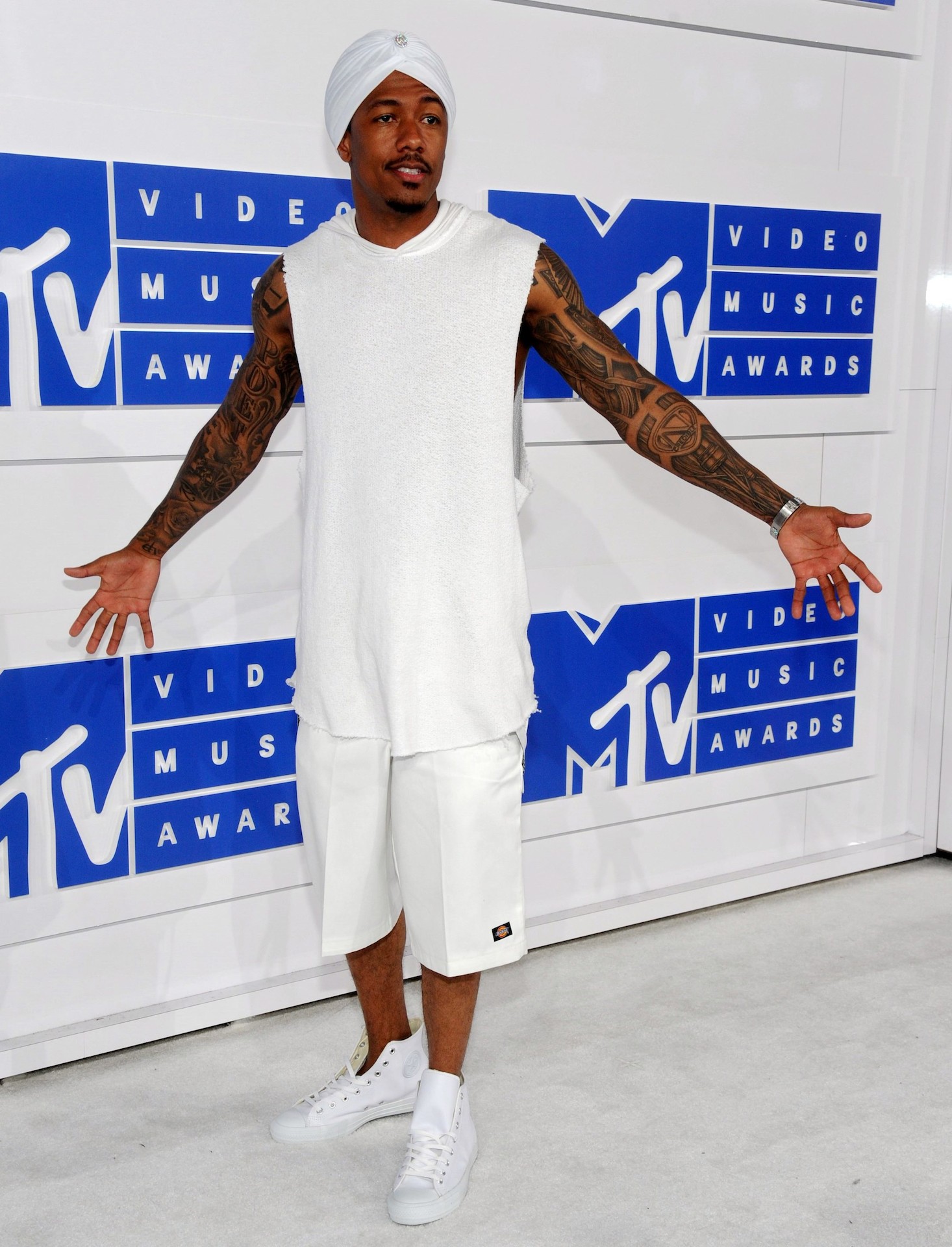 El rapero Nick Cannon no quiso pasar desapercibido, llevando un turbante y sus numerosos tatuajes al aire.