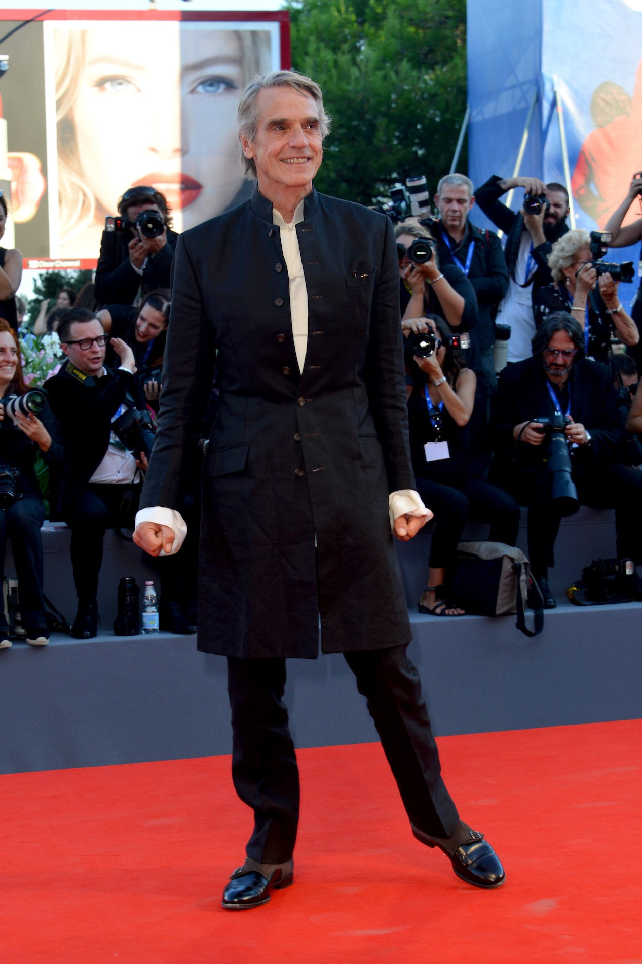 El mítico actor Jeremy Irons vistió un abrigo abotonado, con ligero estilo pirata.