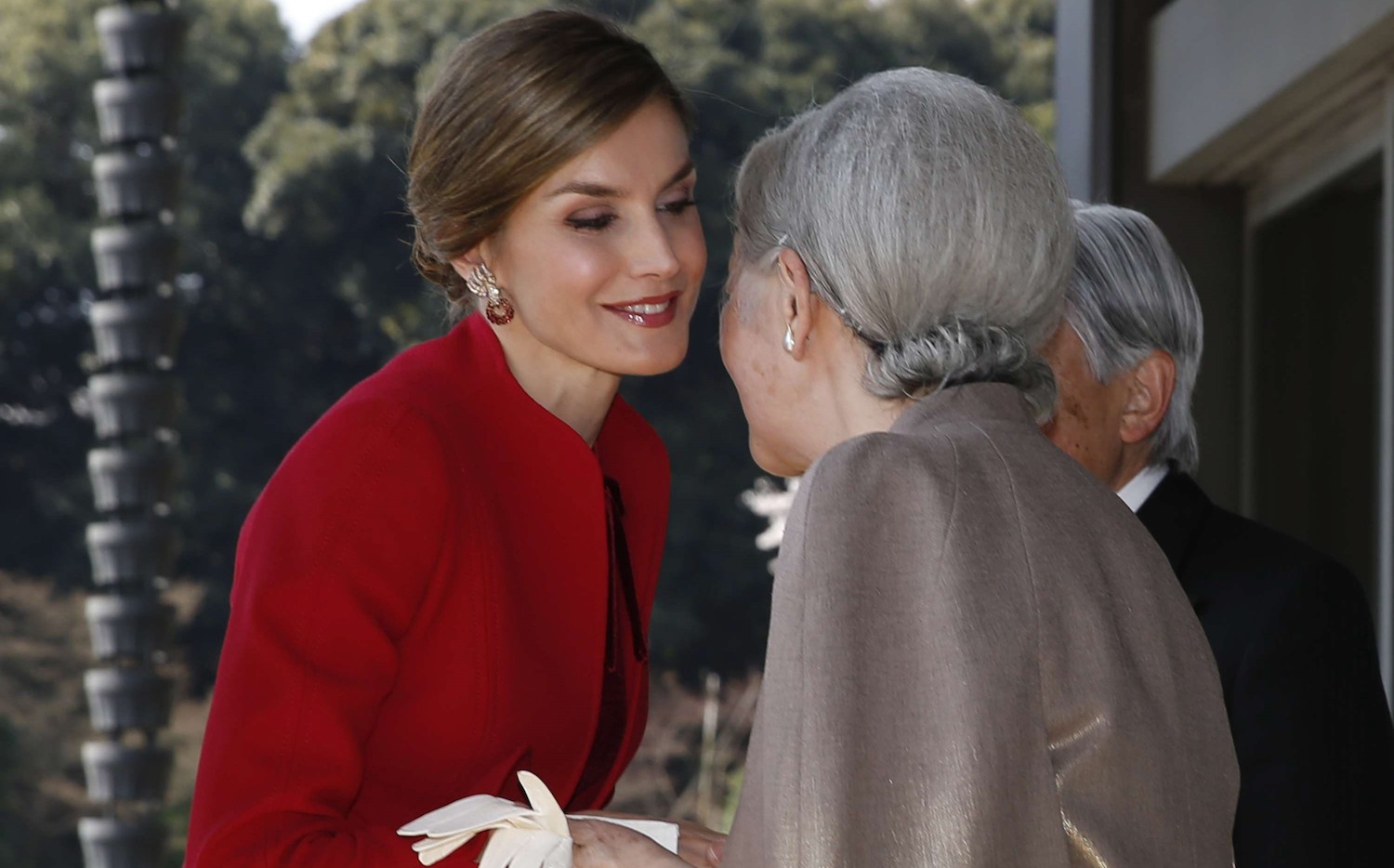 Si al bajar del avión su look fue de lo más sofisticado con un vestido de tubo de cuero, stilettos y chaqueta negra y beige, en su encuentro con los emperadores Akihito y Michiko, los herederos Naruhito y Masako y el primer ministro Shinzo Abe en el Palacio Imperial de Tokio, Letizia tampoco ha defraudado.