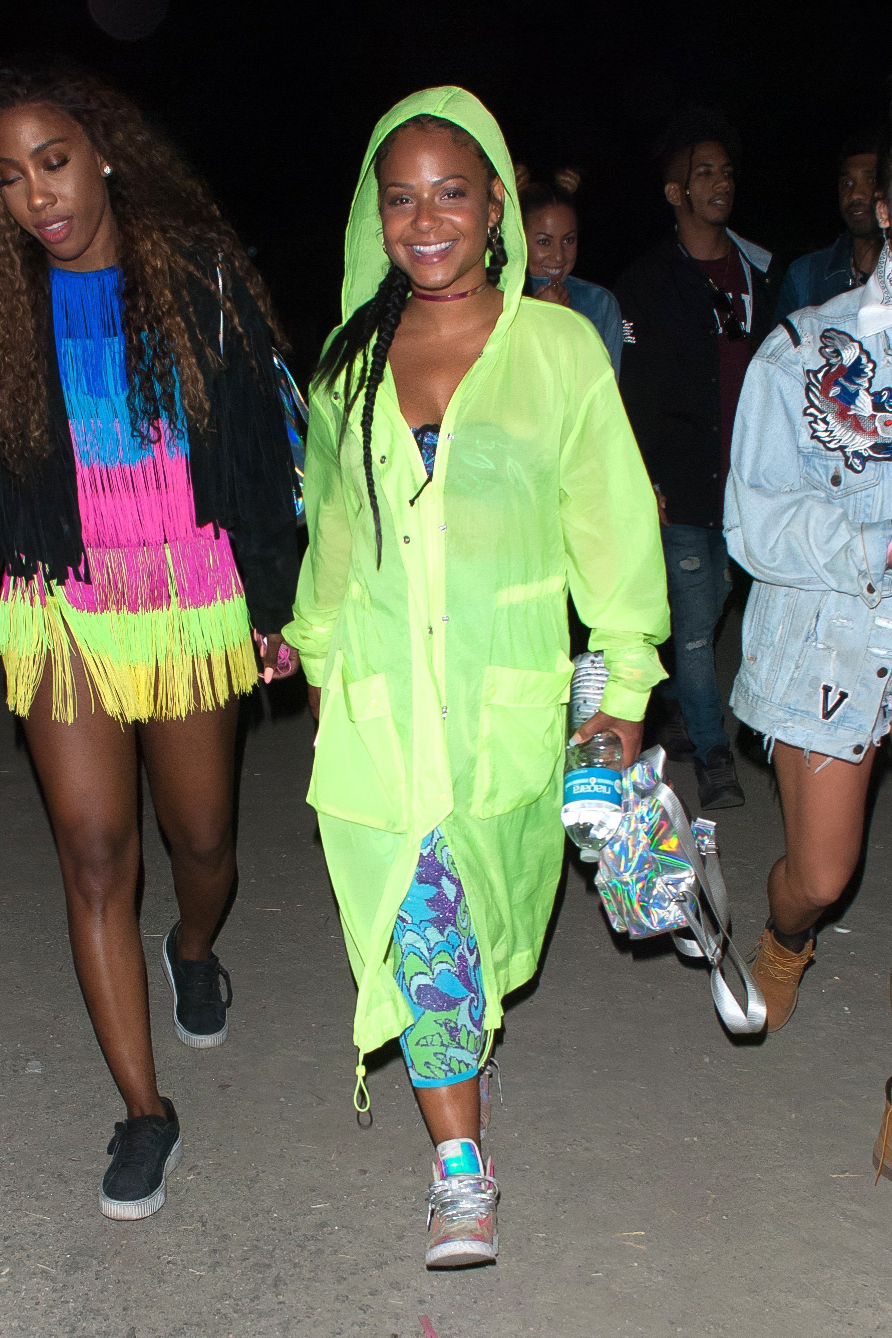 La cantante Christina Millian fue muy cómoda pero llamativa. Chubasquero verde fosforito, pantalones multicolor y mochila brillante.