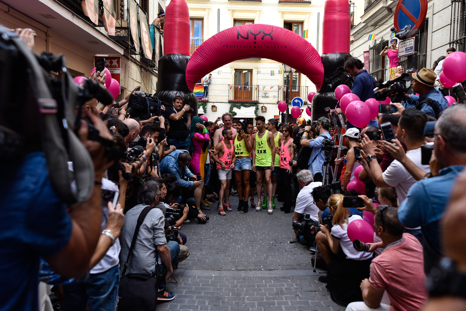 Los participantes, preparados y nerviosos, en el foco de la multitudinaria prensa acreditada para cubrir esta competición que se celebra en el barrio de Chueca cada fiesta del Orgullo.