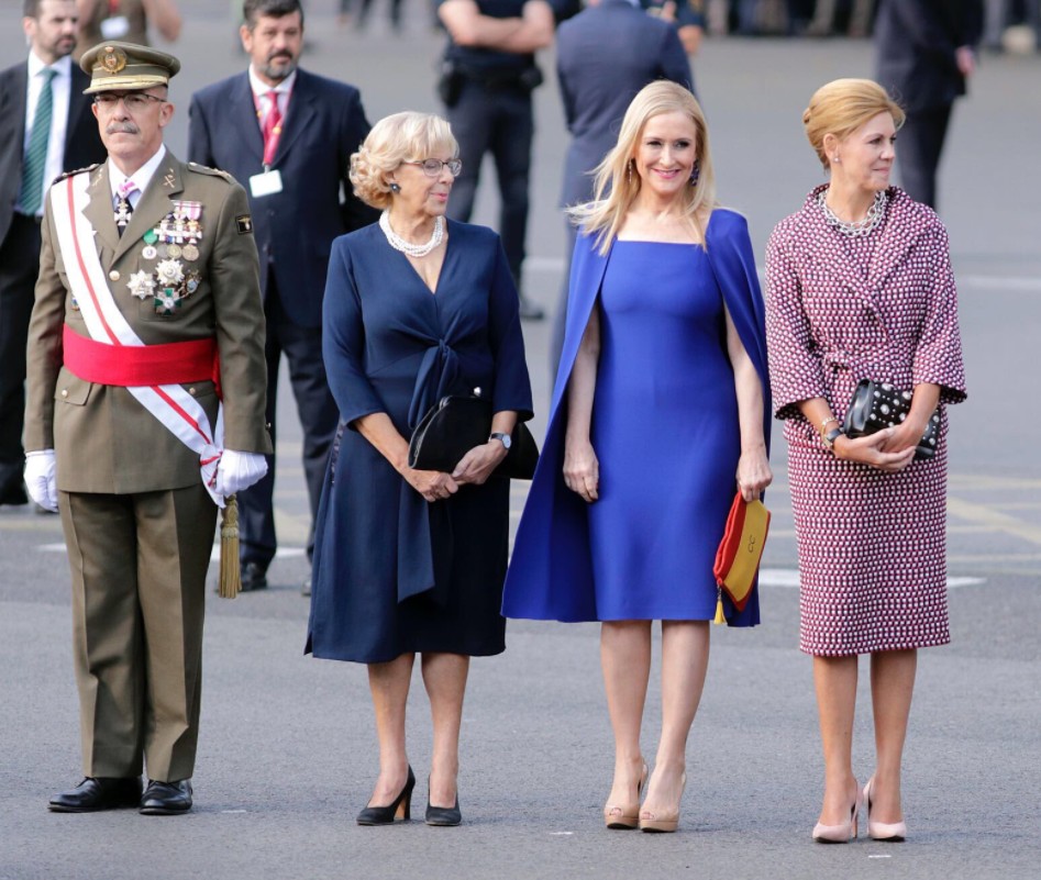 La alcaldesa de Madrid, la presidenta de la Comunidad de Madrid y la ministra de defensa antes del comienzo del desfile del Día de la Fiesta Nacional.