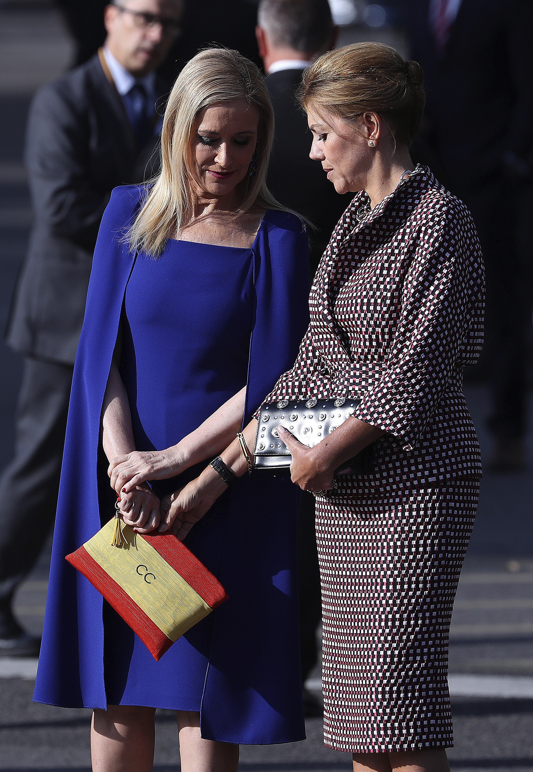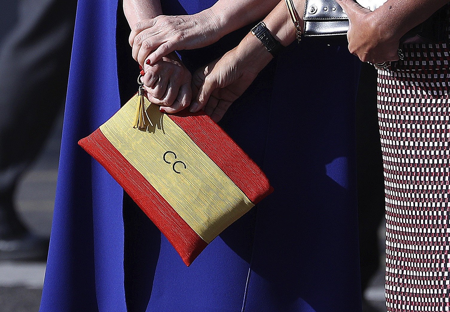La presidenta de la Comunidad de Madrid lució un clutch con la bandera de España que arrasa con sus iniciales (CC) bordadas y un conjunto azul con capa obra de Juanjo Oliva para El Corte Inglés.