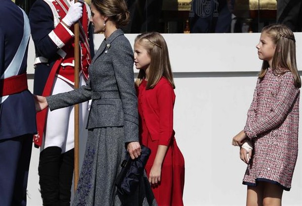 La Princesa de Asturias ha aparecido con un vestido en rojo, corte a la cintura y falda capa de Carolina Herrera de cuello redondo y sin mangas combinado con una chaqueta roja. Por su parte la Infanta Sofía ha lucido un conjunto vestido línea estampado en tweed en rojo blanco y negro, abierto por detrás con cremallera metálica firmado por la viguesa Pili Carrera, que tiene un precio de 119 €.