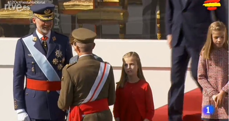 La familia real al completo disfrutando del desfile con motivo de la Fiesta Nacional, que ha llenado de banderas españolas el Paseo de la Castellana de Madrid.