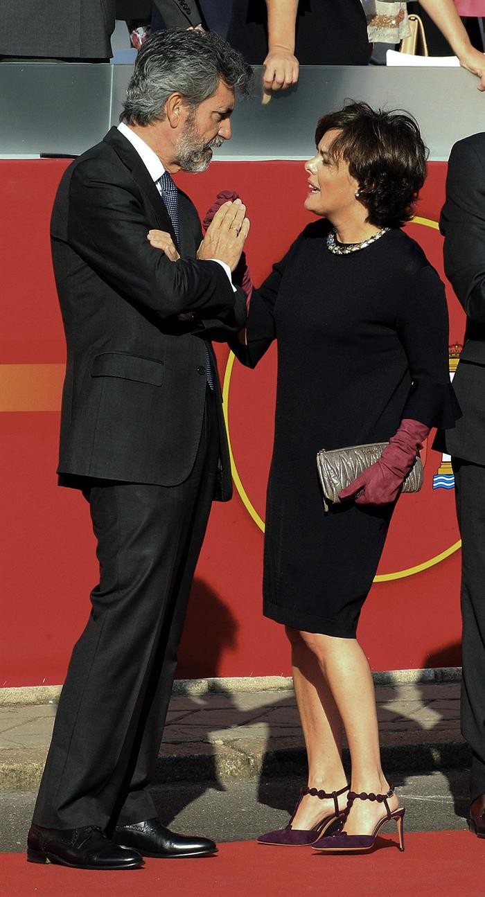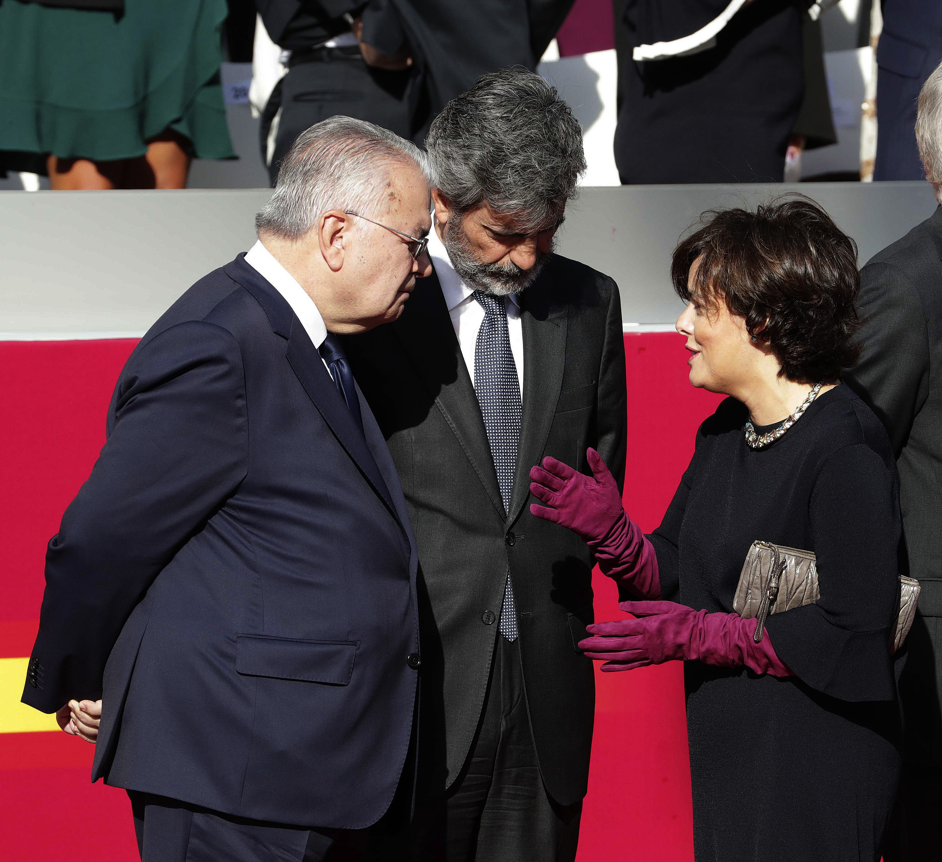 La vicepresidenta del Gobierno conversa con los presidentes, del Tribunal Constitucional, Juan José González Rivas, y del del Tribunal Supremo y del Consejo General del Poder Judicial, Carlos Lesmes.