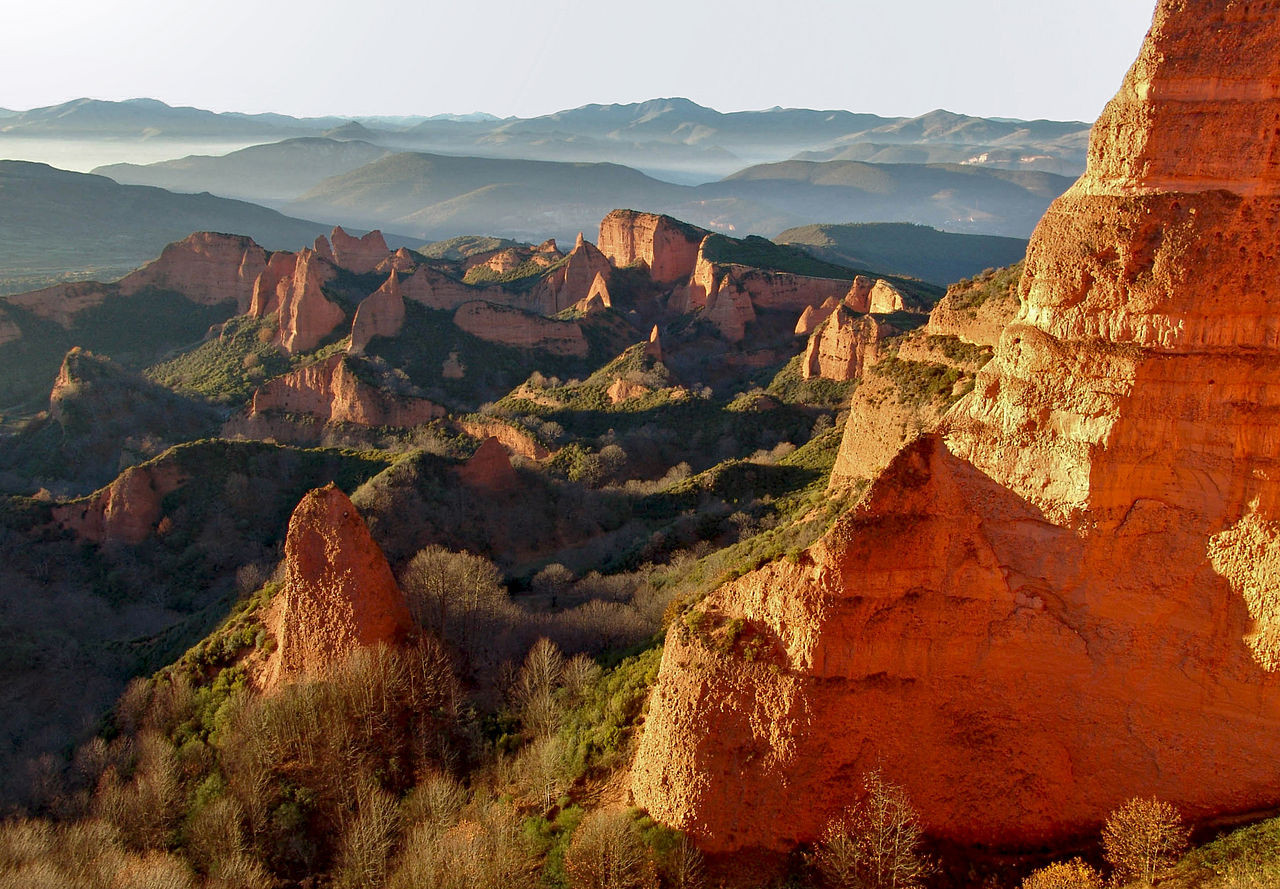 Las Médulas, en el Bierzo, es la mayor mina de oro a cielo abierto de todo el Imperio y permitía mantener a las legiones. Las labores de ingeniería que realizaron para la extracción de oro supuso la alteración del medio ambiente en la zona. A partir de su abandono en el siglo III d.C., la naturaleza se abrió paso en las minas y dio como resultado un paisaje de montañas arcillosas con curiosas formas y arenas rojizas mezcladas con vegetación. El mejor sitio donde podrás disfrutar de esta vista es el Mirador de Orellán.