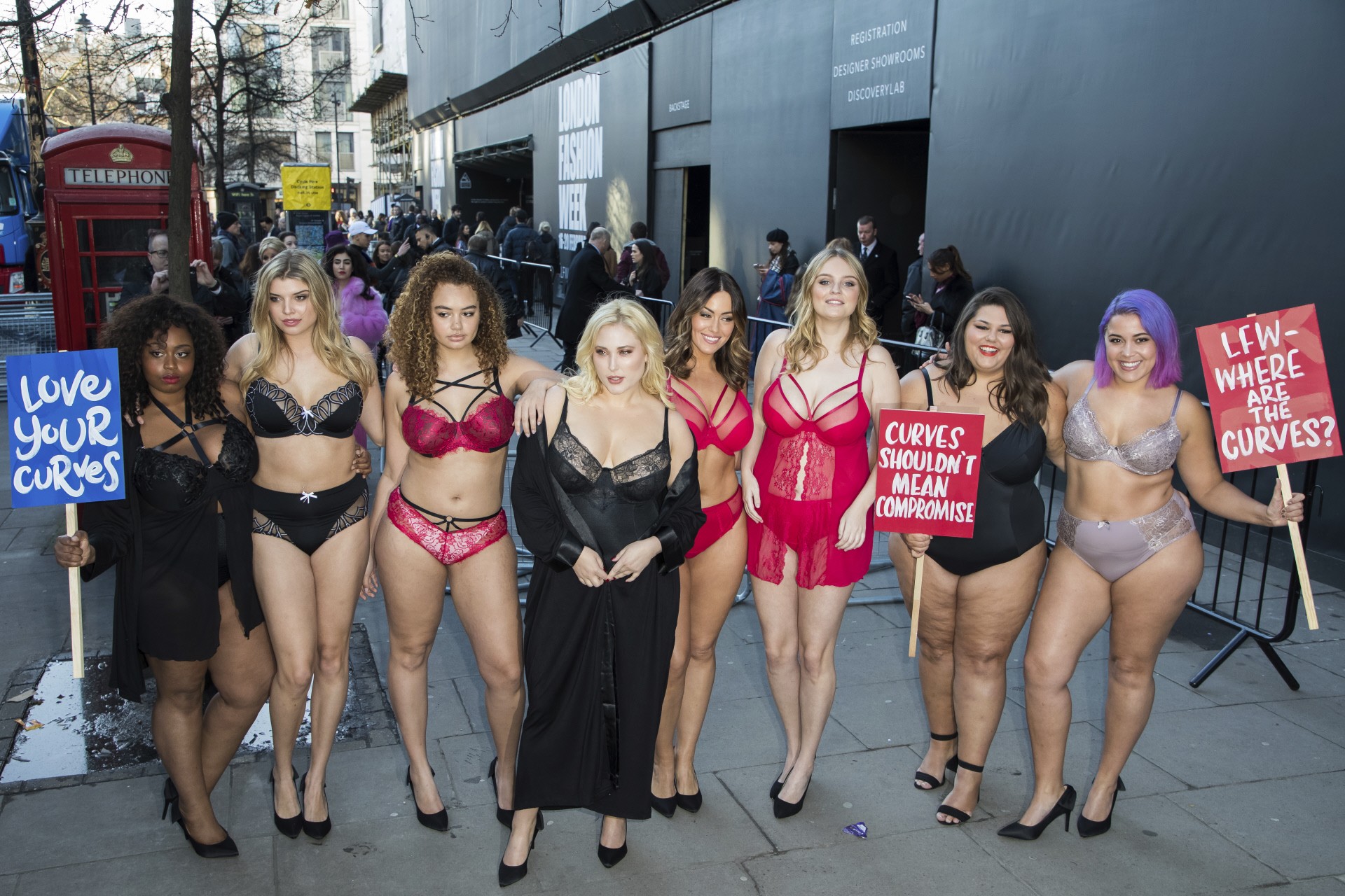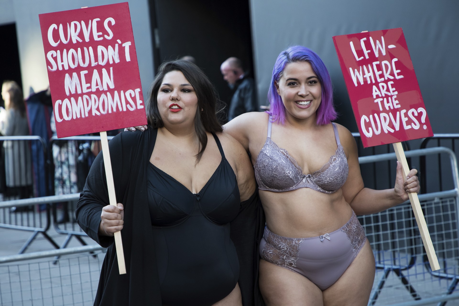 Acompañada de otras modelos de talla grande, el grupo protestó contra los dictados estéticos del mundo de la moda y los estereotipos generados por el mundo de la pasarela. Lo hicieron en ropa interior y con pancartas que criticaban la ausencia de curvas naturales.