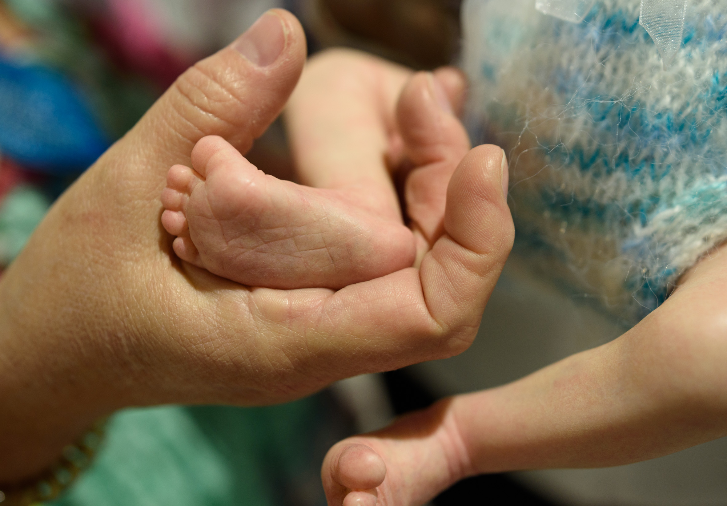 El detalle de este tipo de muñecos está cuidado al máximo. En la foto, una mujer sostiene el pie de uno de los bebé Reborn en el el que se aprecia tanto el color, como las marcas propias de una piel humana.