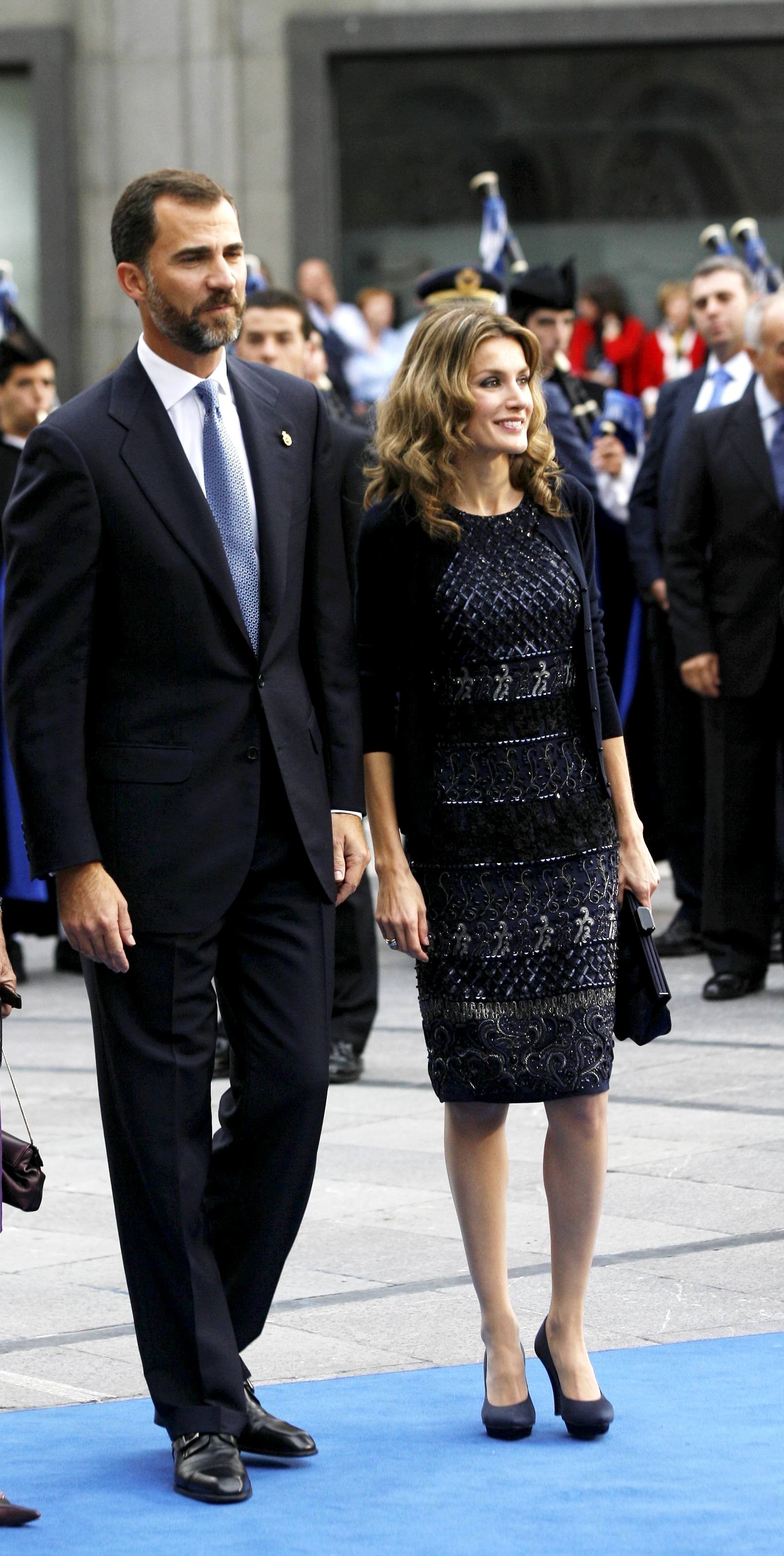 La entonces futura reina se decantó en 2009 por un vestido azul marino bordado con pedrería en azabache que años después ha reciclado en múltiples ocasiones.