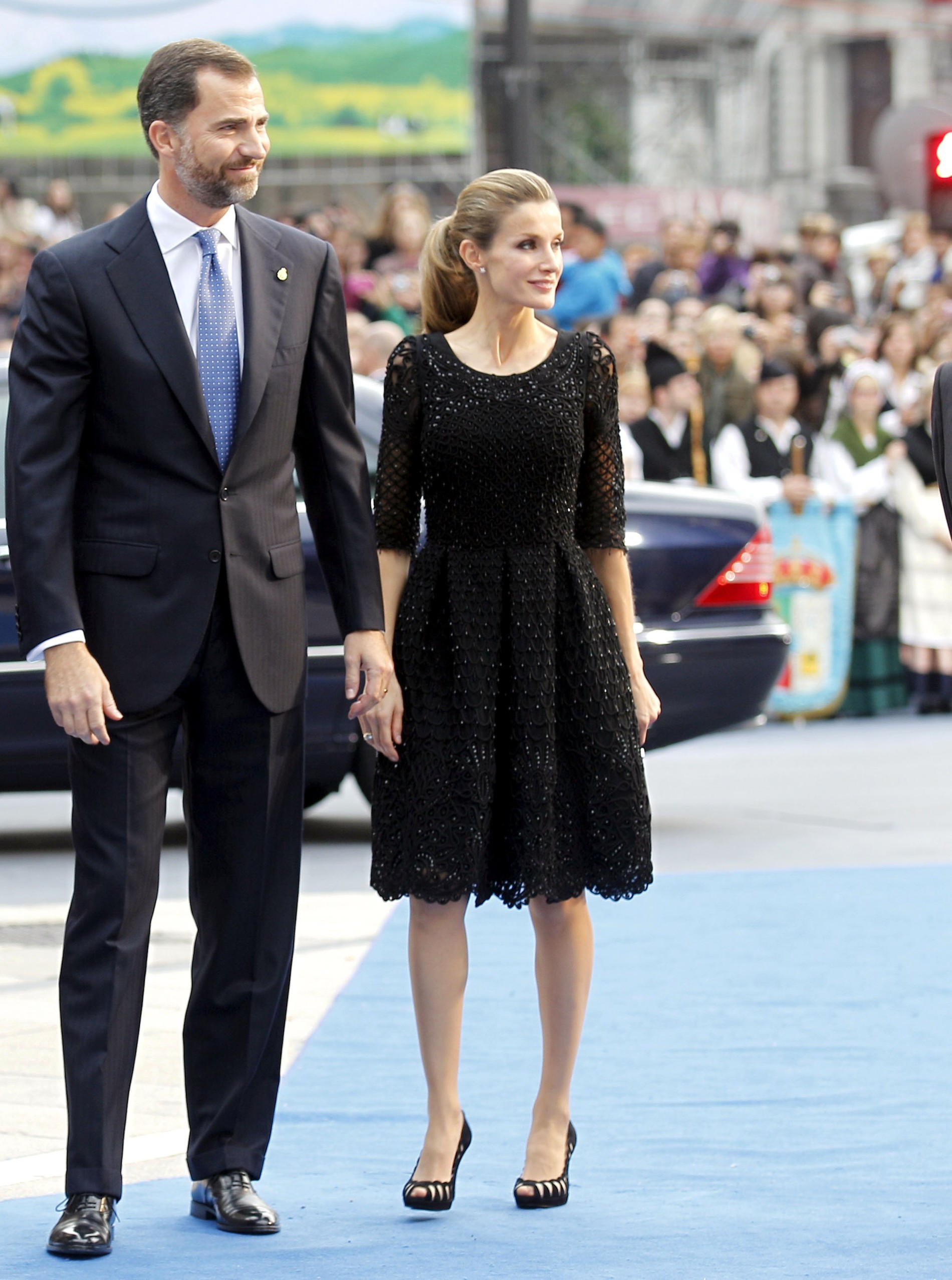 Doña Letizia, muy favorecida con una coleta alta y con este espectacular vestido de guipur en color negro en los Premios de 2010.