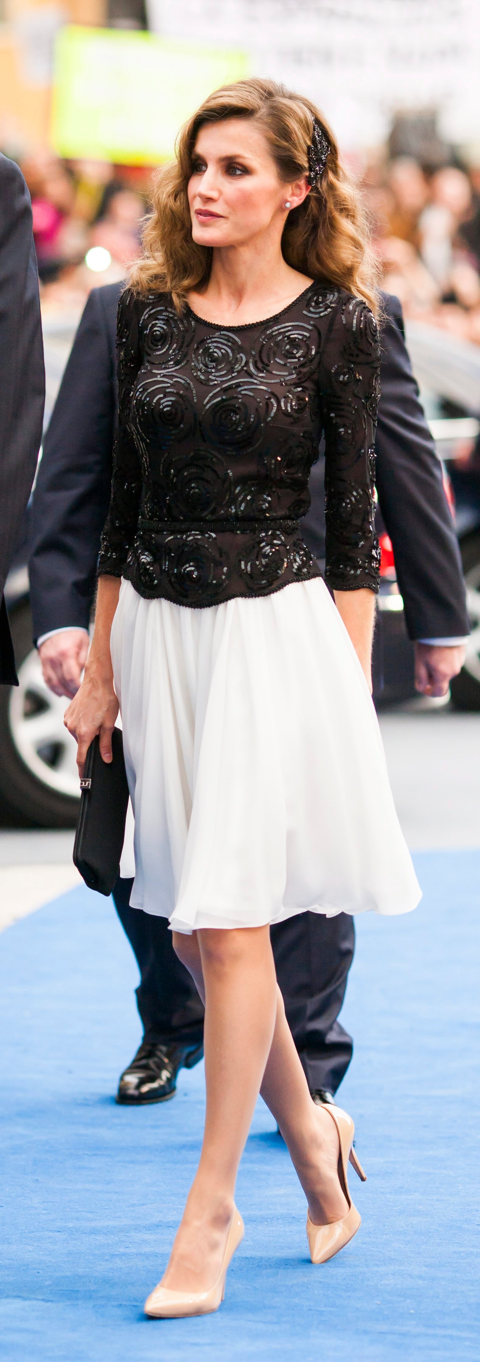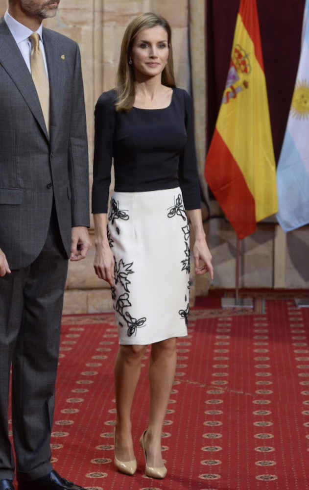 Para esta ocasión, Letizia recicló uno de los diseños de Felipe Varela y se puso lo mismo que el día de la abdicación de Don Juan Carlos. Camisa de manga tres cuartos negra, y falda lápiz de seda blanca con bordados de flores y mariposas, a media pierna.