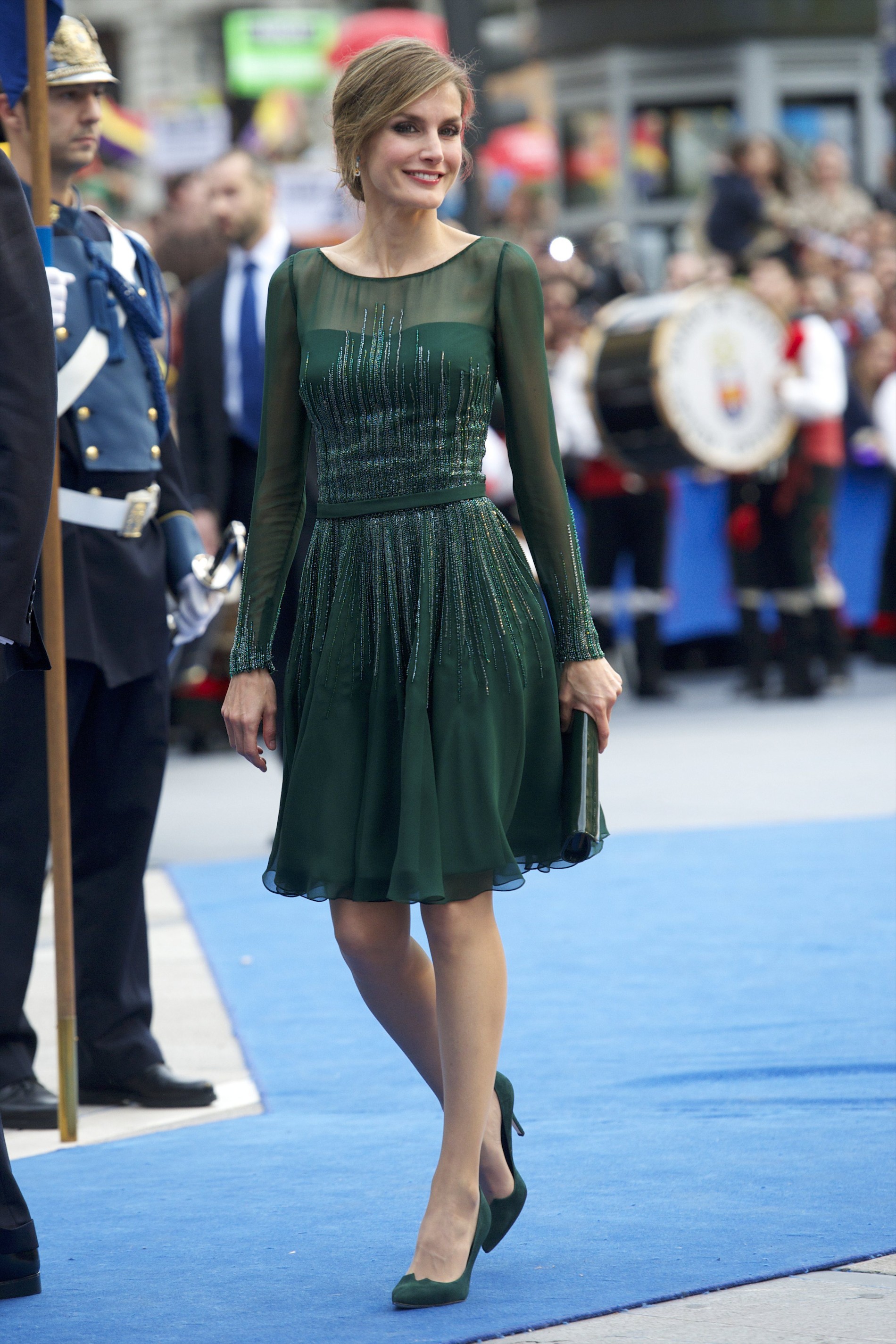 En aquel momento se desconocía que los premios de 2013 iban a ser los últimos a los que doña Letizia acudiría como princesa. Para aquella ocasión eligió un vestido espectacular realizado en georgette de seda en color verde, bordado con cristalitos, diseñado, por supuesto, por Felipe Varela.