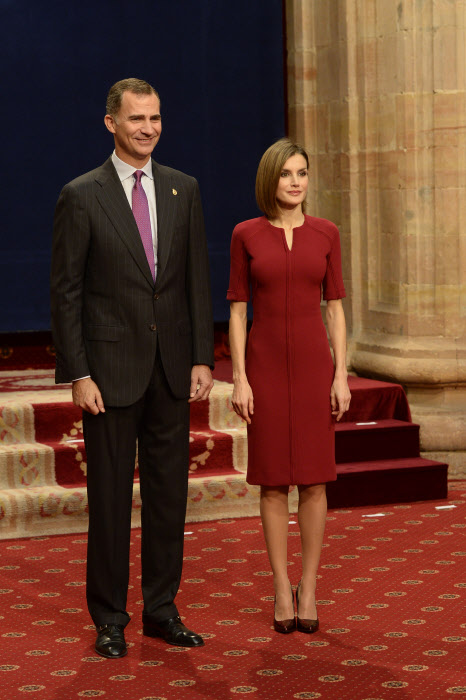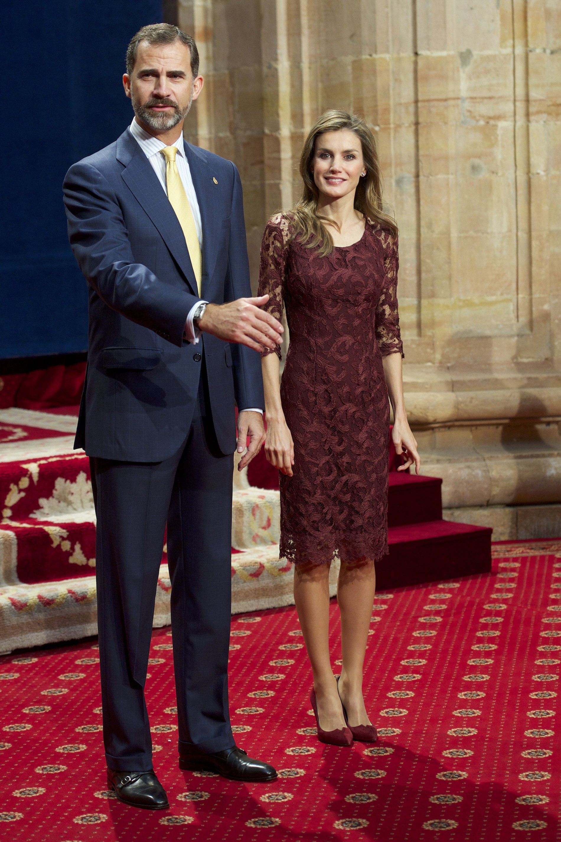 En la entrega de medallas a los premiados de 2013 en el Hotel Reconquista, la entonces princesa de Asturias repetía el vestido color burdeos que lució días antes durante la Fiesta Nacional de 2013.