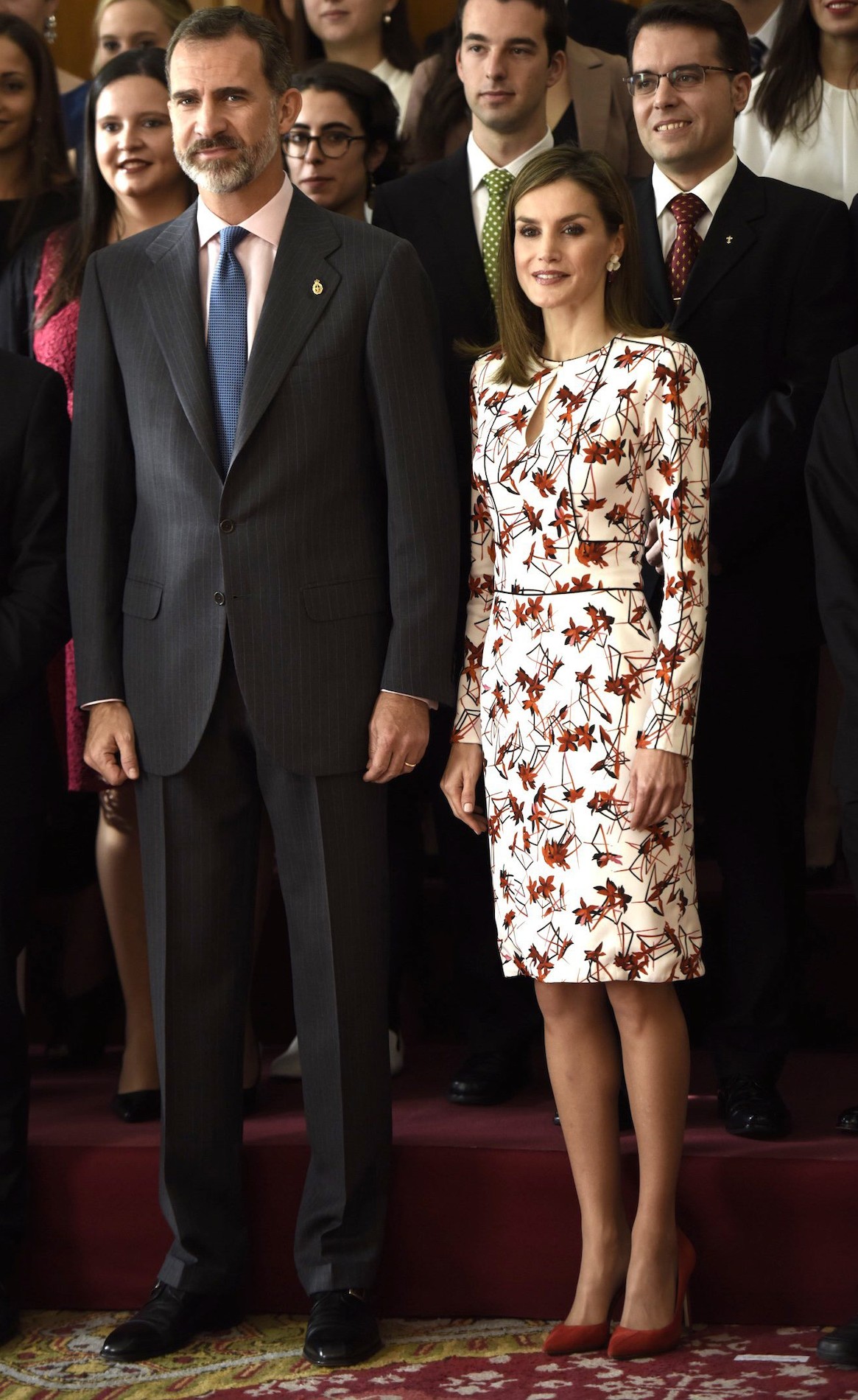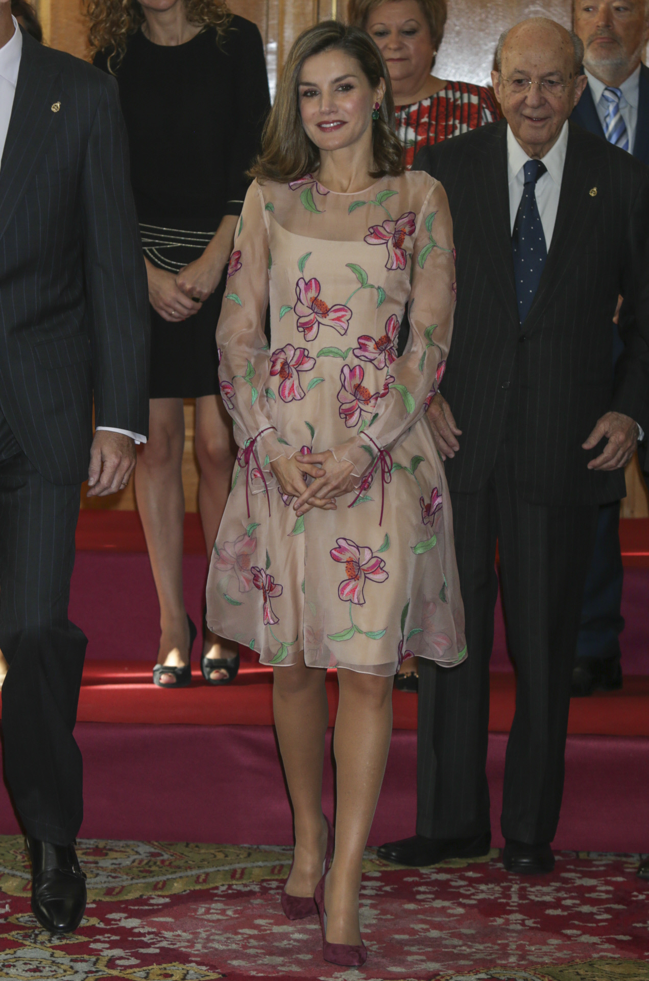 En la recepción a las autoridades y premiados de 2016, el vestido de Doña Letizia fue todo un acierto después del polémico vestido que vistió durante el concierto de la noche anterior. Por primera vez, cambió de diseñador para vestir un diseño de Carolina Herrera muy favorecedor. El diseño es en crepé, de color blanco y estampado de flores rojizas, manga larga y discreto escote en lágrima.