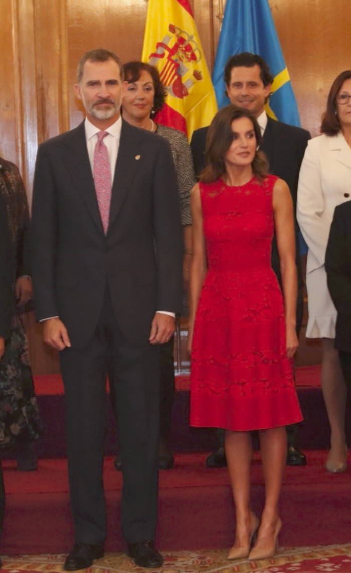 Para la jornada de audiencias presidida por los Reyes en el Hotel Reconquista de Oviedo, doña Letizia cambio Varela por CH Carolina Herrera que estrenó en otra ocasión. Se trata de un vestido rojo sin mangas -como ya acostumbra a lucir la Reina- con falda de vuelo decorado de arriba a abajo con encaje floral. En los pies, unos salones de Prada en nude y por fin, doña Letizia decidió soltarse el pelo después de varias apariciones con el pelo recogido.