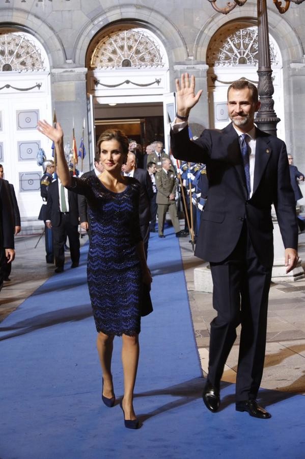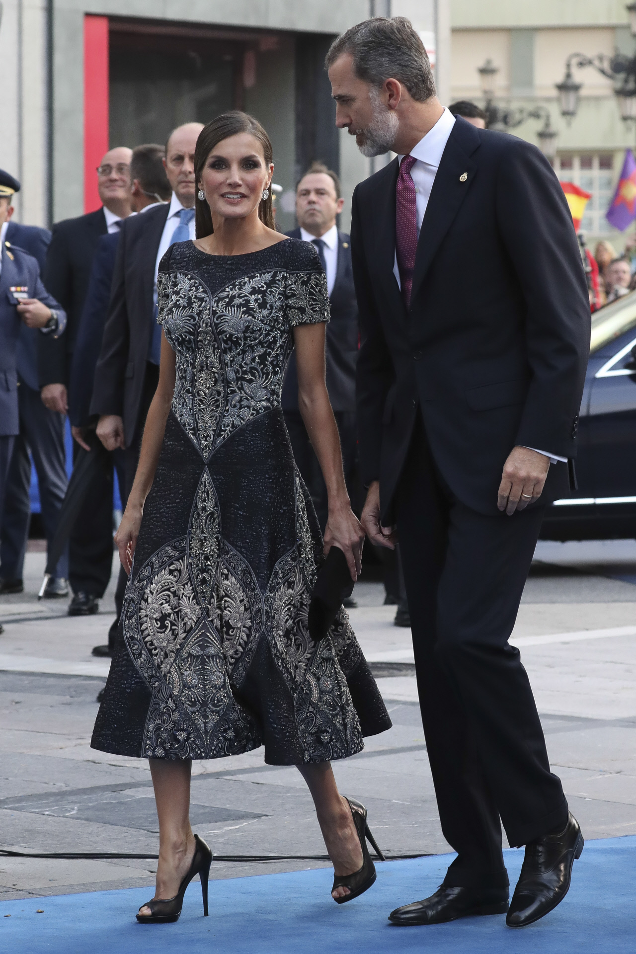 Doña Letizia llegó al Teatro Campoamor sin grandes sorpresas. Para la ceremonia de los Premios Princesa de Asturias 2016, la Reina volvió a confiar en Felipe Varela, aunque no estuvo muy acertada. El modelo, de seda en color 'nude' con falda y bordado negro sobre tul, dejaba a la vista los brazos y resaltaba en cierto modo su figura. El pelo lo llevaba recogido en una coleta baja.