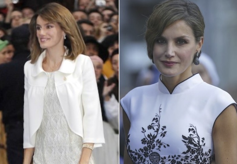 En 2011 la entonces princesa de Asturias lució otro Varela en color moka con flores bordadas, con un corte similar al que llevó dos años después de color verde. Letizia acompañó el look con un recogido que le echaba algún año encima.