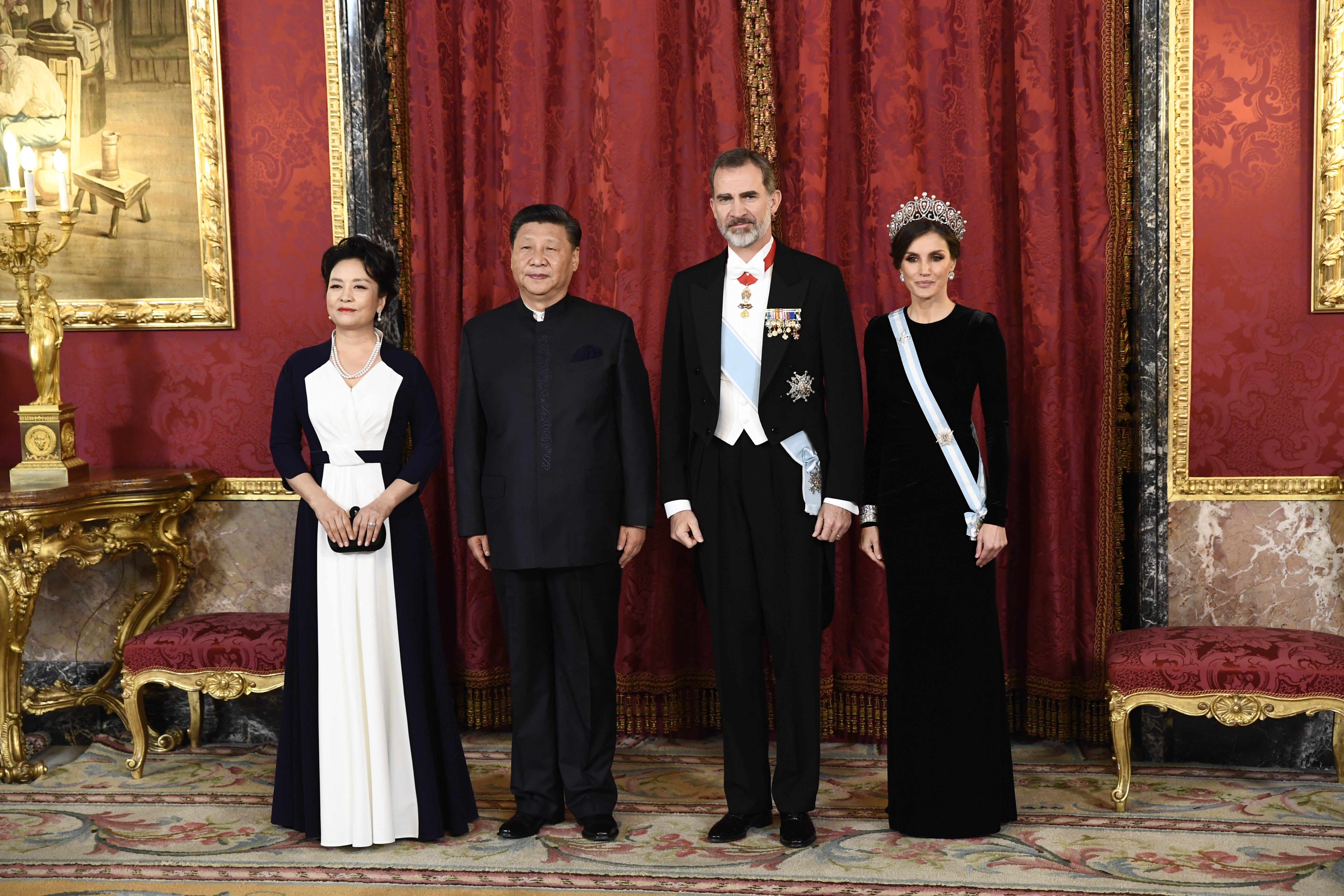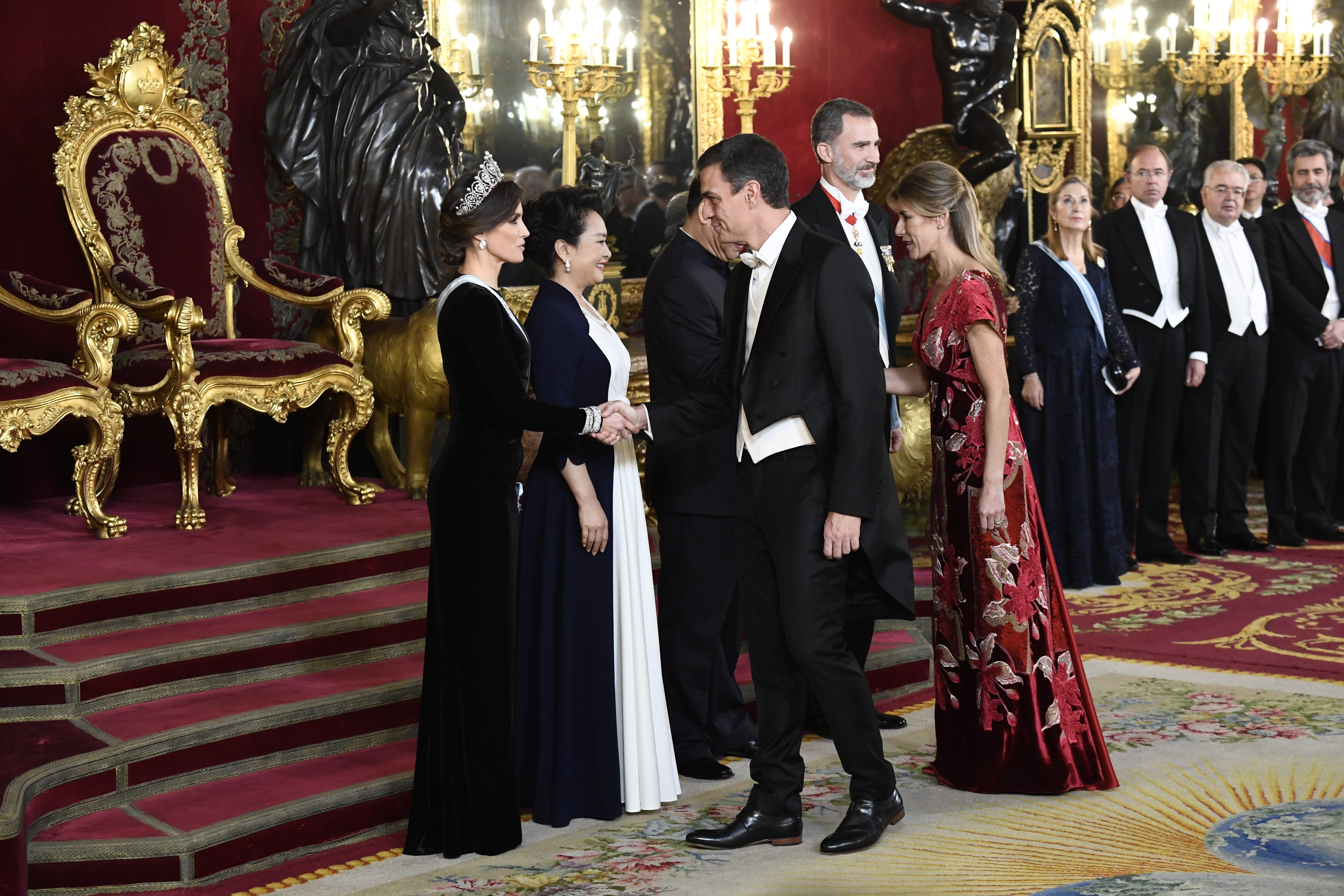 La visita oficial a España del presidente Xi Jinping y su esposa Peng Liyuan tuvo su broche final en una cena de gala organizada en el Palacio Real a la que acudieron numerosas personalidades. La llegada del mandatario chino generó una gran expectación, pero también el duelo de estilismos entre doña Letizia y la mujer del presidente, a las que se unió por la noche Begoña Gómez, mujer de Pedro Sánchez, que se estrenaba en una cena de este tipo.