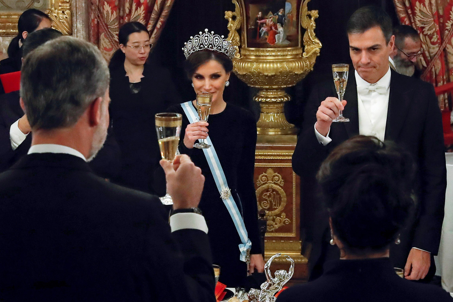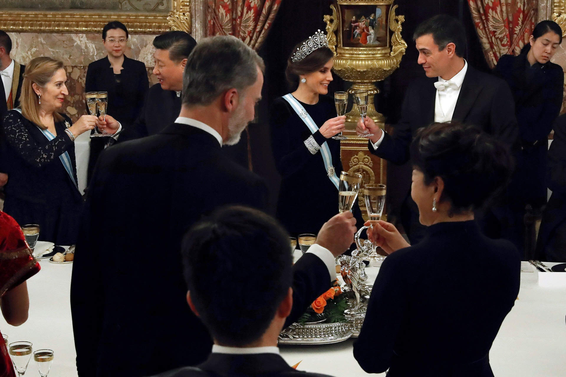A la derecha de doña Letizia, el presidente chino Xi Jinping, brinda con la Presidenta del Congreso de los Diputados, Ana Pastor.