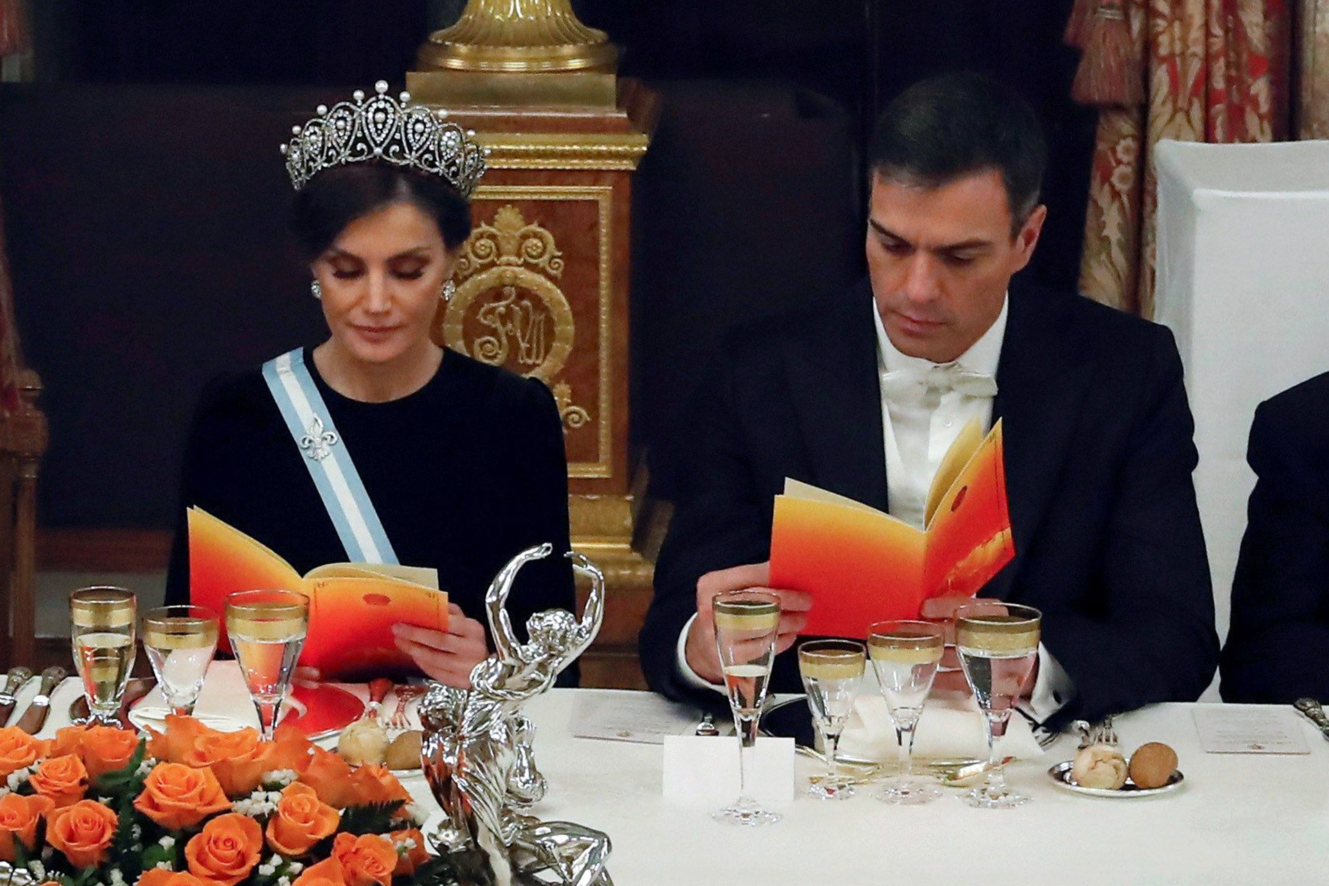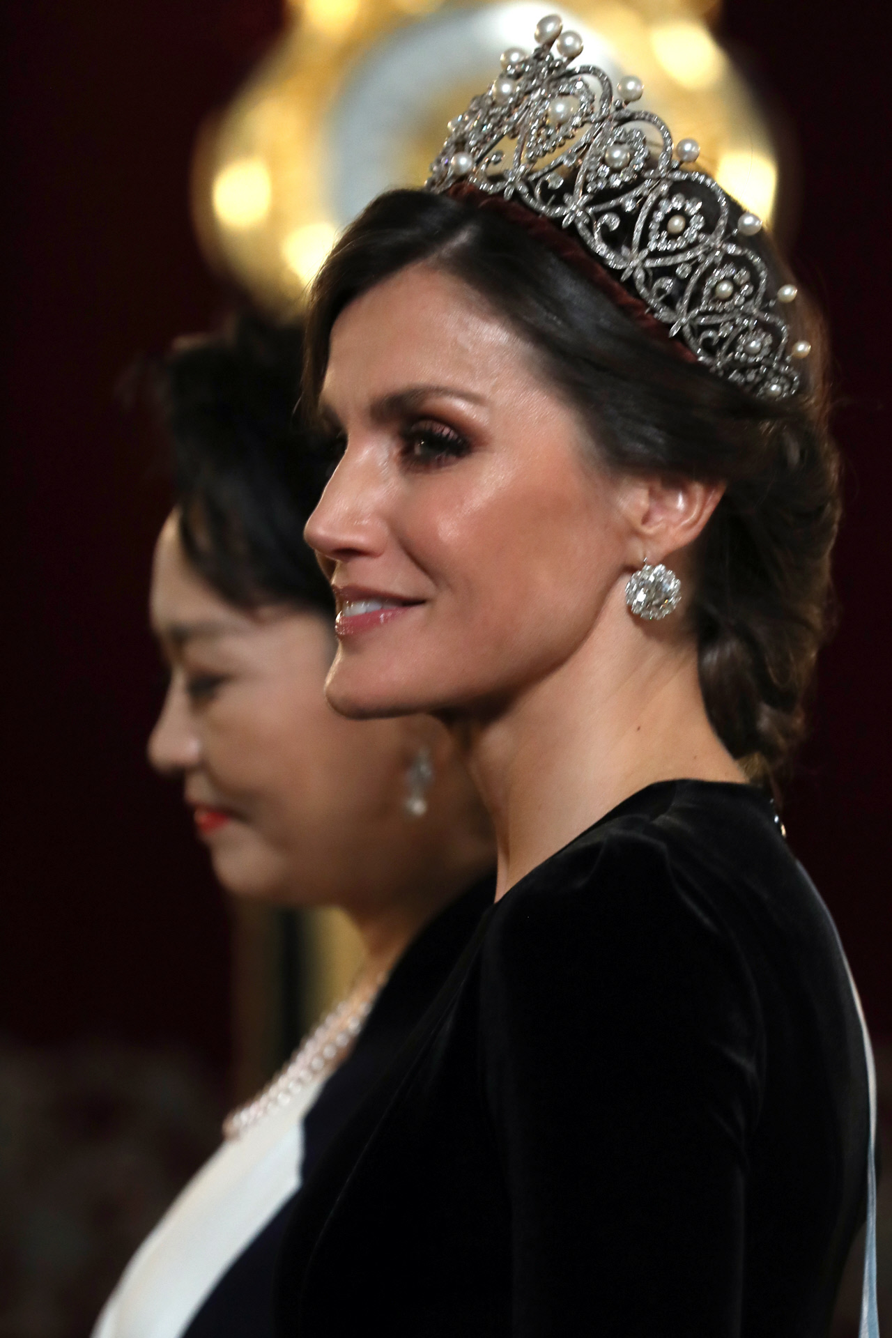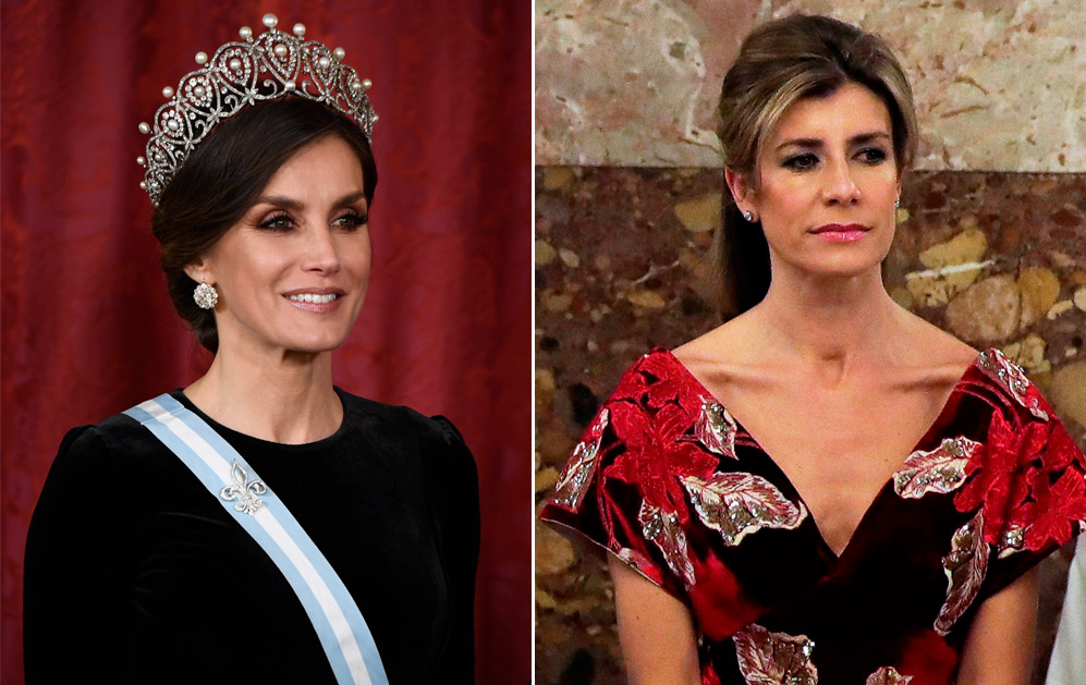 La reina Letizia repitió un vestido negro largo de terciopelo que ya lució durante la visita del presidente argentino Mauricio Macri en 2017. La pieza es un vestido de Felipe Varela. Las pulseras gemelas de Cartier pertenecen a la reina Victoria Eugenia, un regalo de Alfonso XIII. La banda de la Orden de Carlos III estaba sujeta con el broche de la flor de lis, emblema de la familia Borbón.