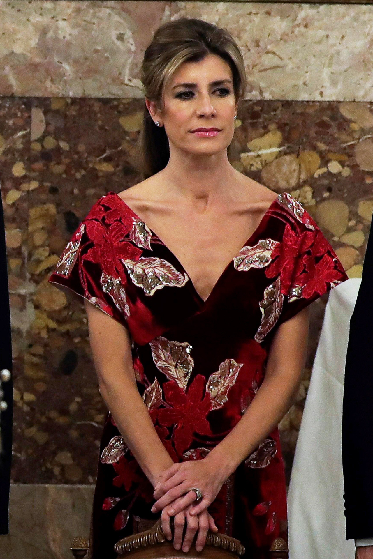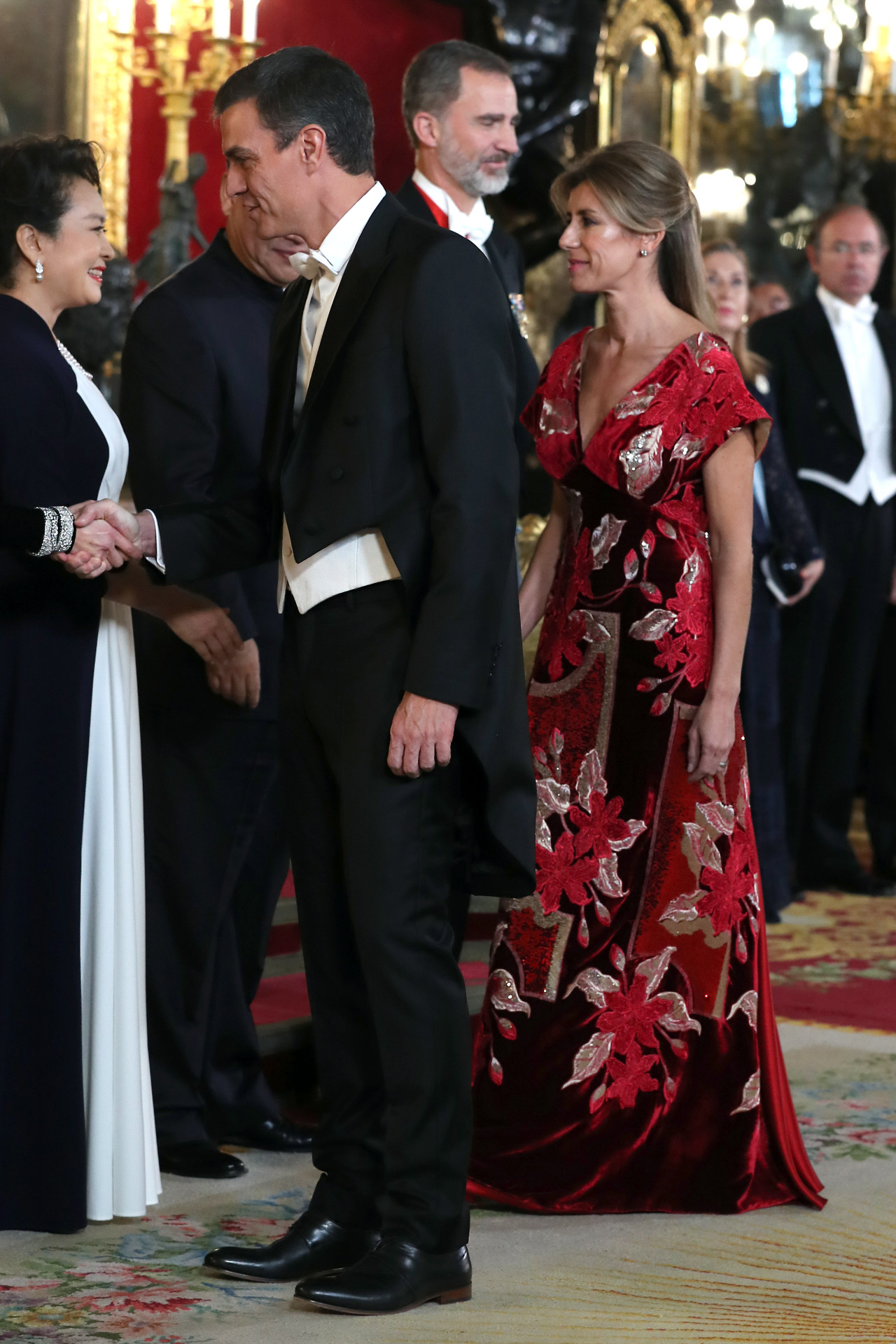 Begoña Gómez escogió de nuevo el rojo, el color de las grandes ocasiones. El vestido largo es un diseño del asturiano Marcos Luengo elaborado en terciopelo rojo y bordado con grandes flores, con generoso escote delantero y en la espalda.